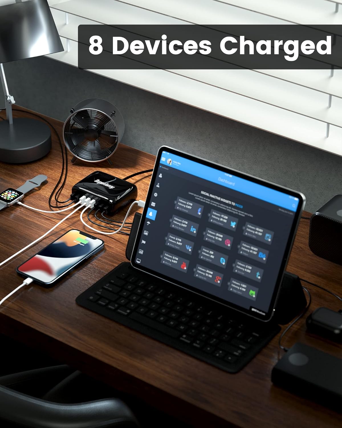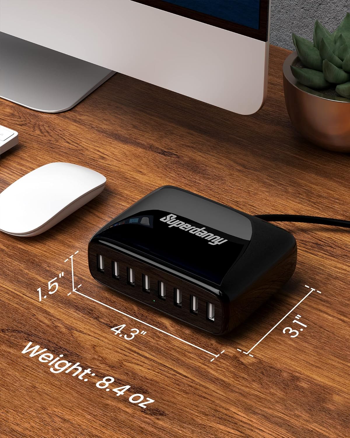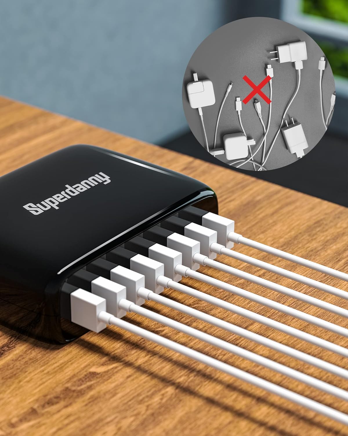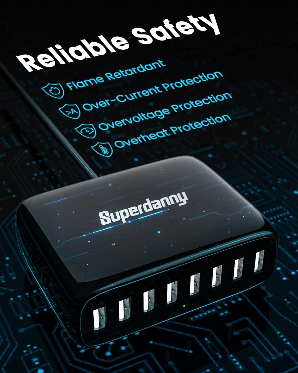 【Charge 8 Devices at A Time】This SUPERDANNY USB charging hub has 8 USB ports for charging up to 8 devices simultaneously—great for phones, tablets, headsets, smartwatches, and other USB-powered devices.