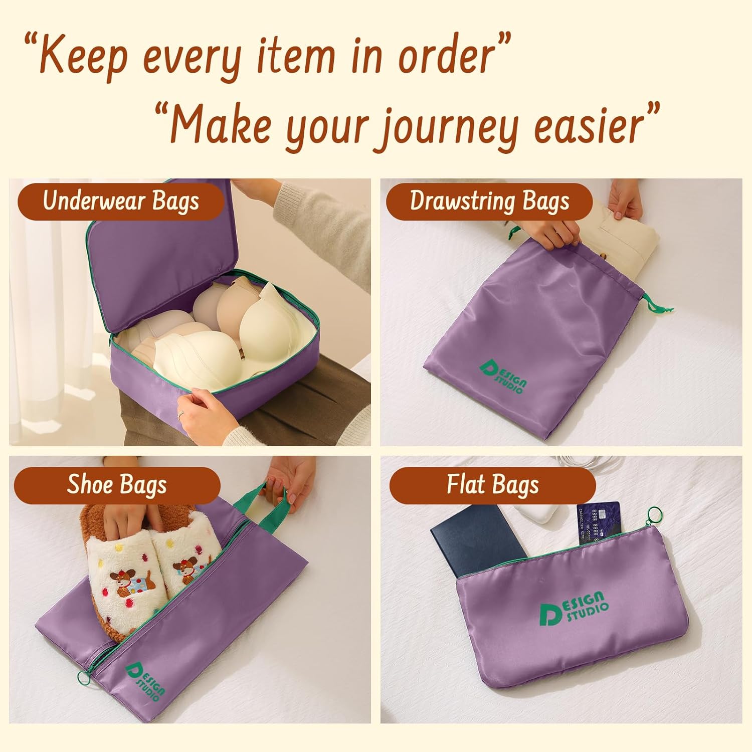 Travel Packing Cubes Set: 8 set travel organizer bags include 3 breathable mesh packing cubes (1 XLarge, 1 Large, 1 Medium ) 1 underwear packing cube, 1 laundry bags, 1 toiletry bag, 1 shoe bag, and 1 makeup bag. Effortlessly organize your clothes, toiletries, makeup, shoes, and more for travel. Designed to maximize luggage space and meet all your storage needs.