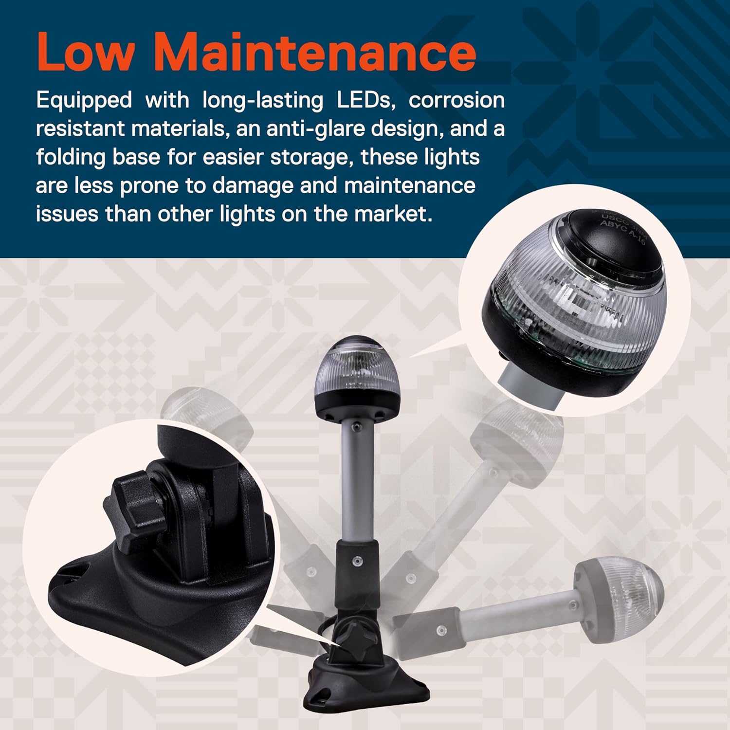 On power-driven boats less than 39.4’ (12m), regulations allow for the stern and masthead light to be replaced by one 360-degree white light. Convenient, but this means that one light is doing all the work and needs to be durable. Built with corrosion-resistant, durable materials, long-lasting LEDs, and a foldable base (on applicable models) that makes it easier to store and prevent damage, these lights are built to last, easy to use, and require almost no maintenance.