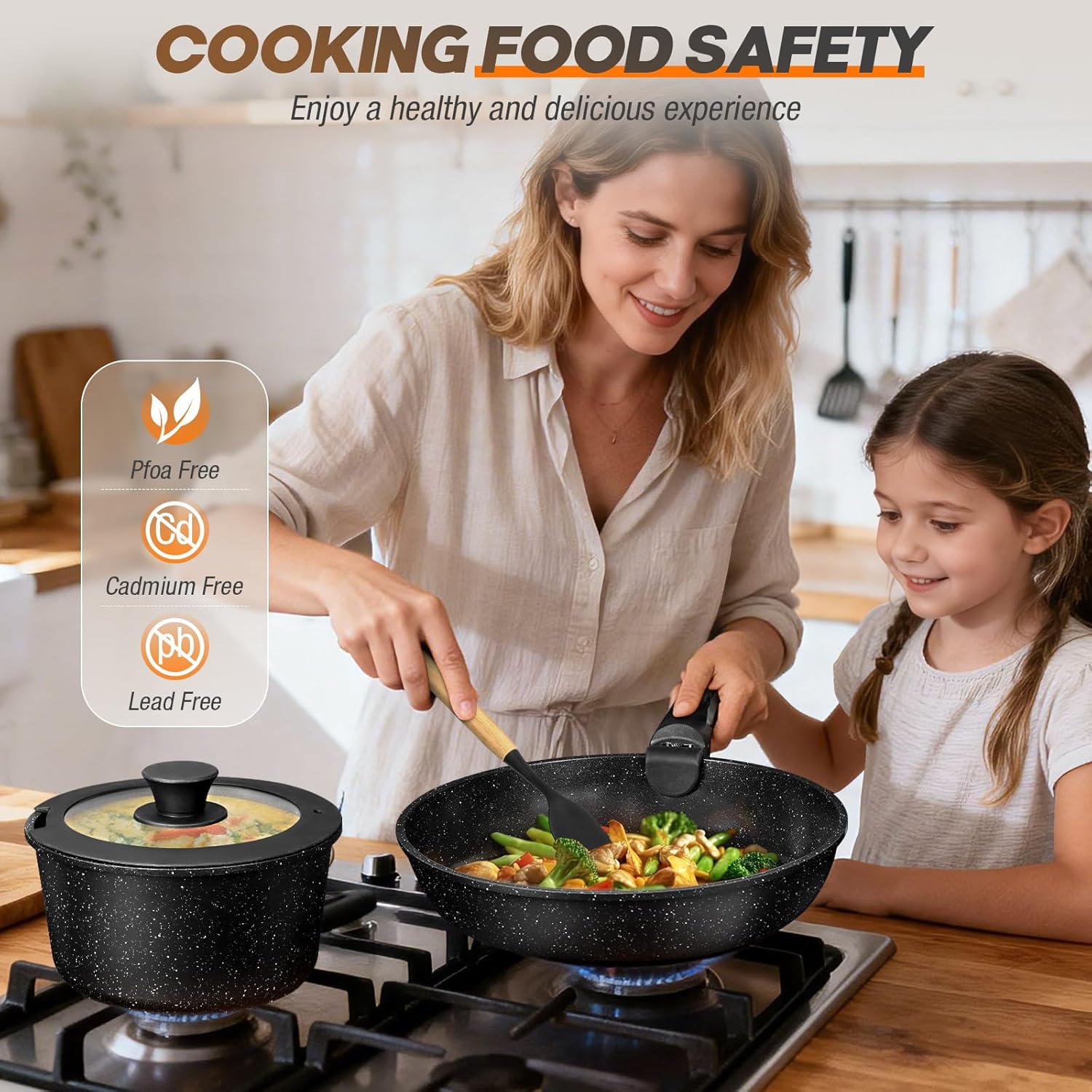 Non-stick and healthy experience: Our kitchen cookware is made of environmentally friendly recyclable aluminum, Teflon-free and guaranteed to be free of PFAS, PTFE, PFOA, lead or cadmium. Stain resistant, durable, and superior non-stick cooking experience.