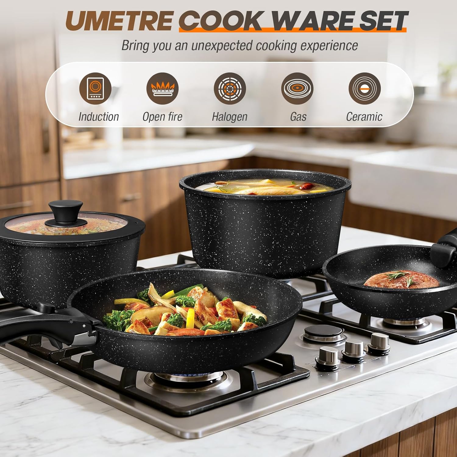 Performance and compatibility: Non-stick pans are made of recycled aluminum, lightweight yet robust, thickened flat base for all stoves, heating quickly and evenly, and high permeability base allows cookware sets to work on all stoves, including induction stoves.
