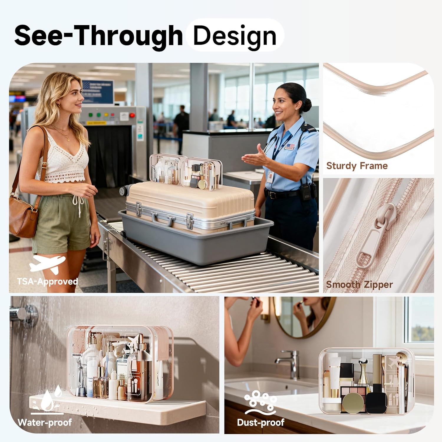 Clear TSA-Ready Bag: Two-bag set stores toiletries and makeup separately to match your routine, with a TSA-friendly design that speeds you through security. Waterproof material wipes clean and prevents leaks, while reinforced seams resist splitting