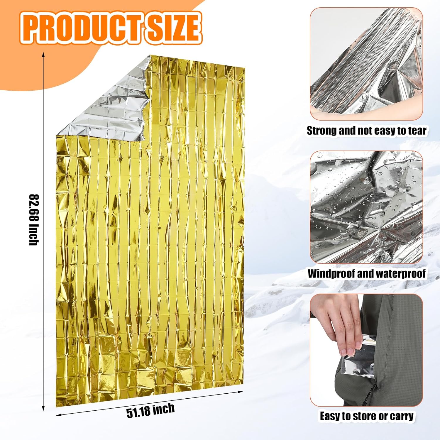 Keep Warm: this 51″ x 83″ space blankets survival reflects up to 90% of body heat, providing instant warmth in extremely cold weather; Gold reflective surface can keep warm, enhance outdoor user visibility and improve safety