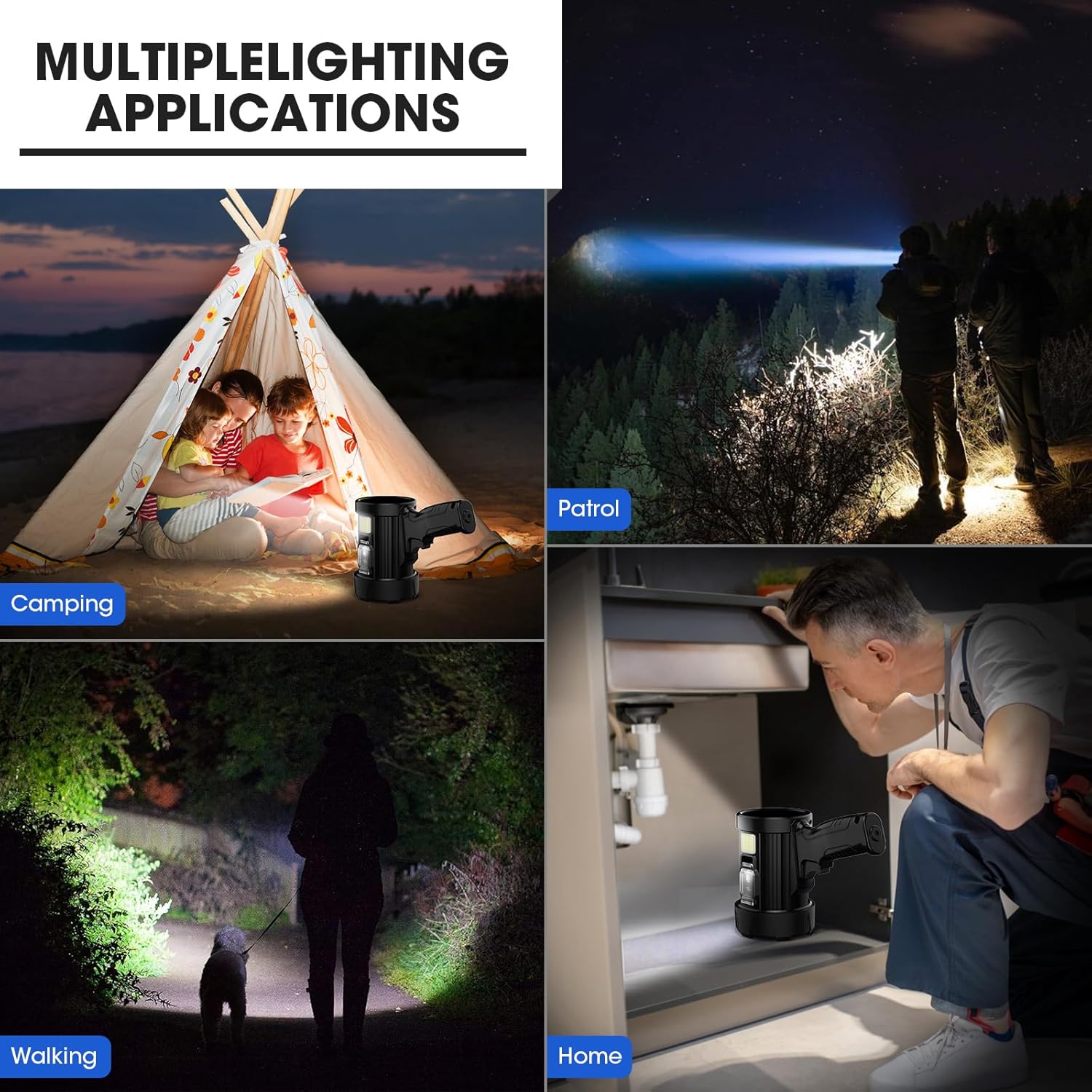 IPX5 Waterproof – withstands splashing water from all directions. Suitable for outdoor environments and harsh weather conditions. Made from high-quality aluminum alloy and ABS materials. Equipped with a large, comfortable handle, suitable for canoeing, camping, dog walking, cave exploration, and home use.