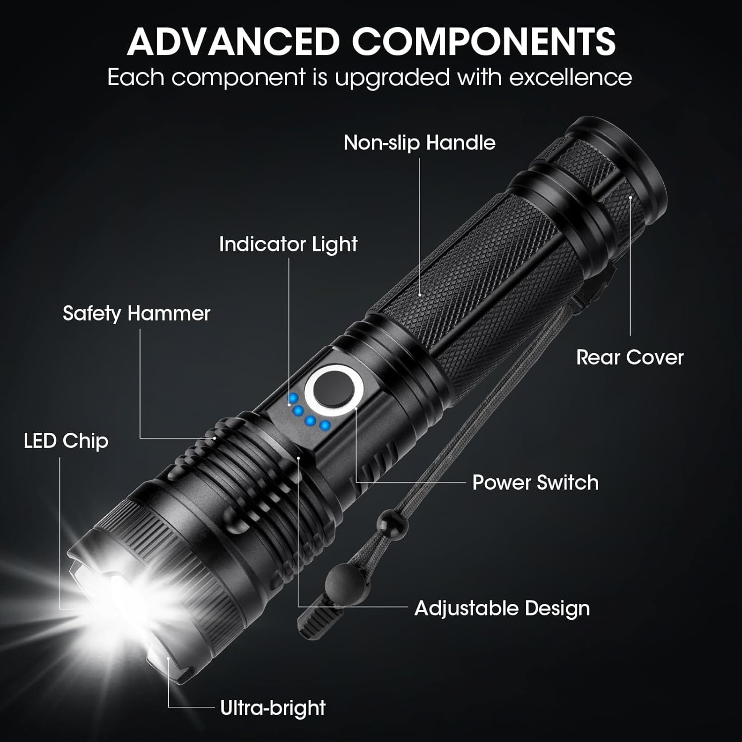 Adjustable Beam: You can adjust the head of the LED rechargeable flashlight to choose between wide-area illumination or long-range illumination. The narrow beam illuminates objects up to 3280 feet away and the wide beam illuminates a room up to 200 square meters.