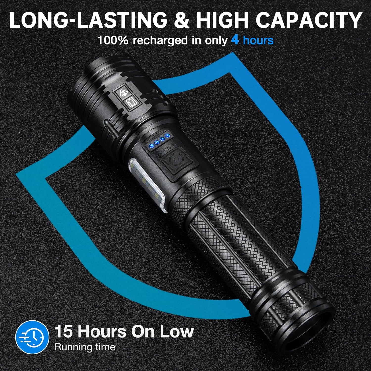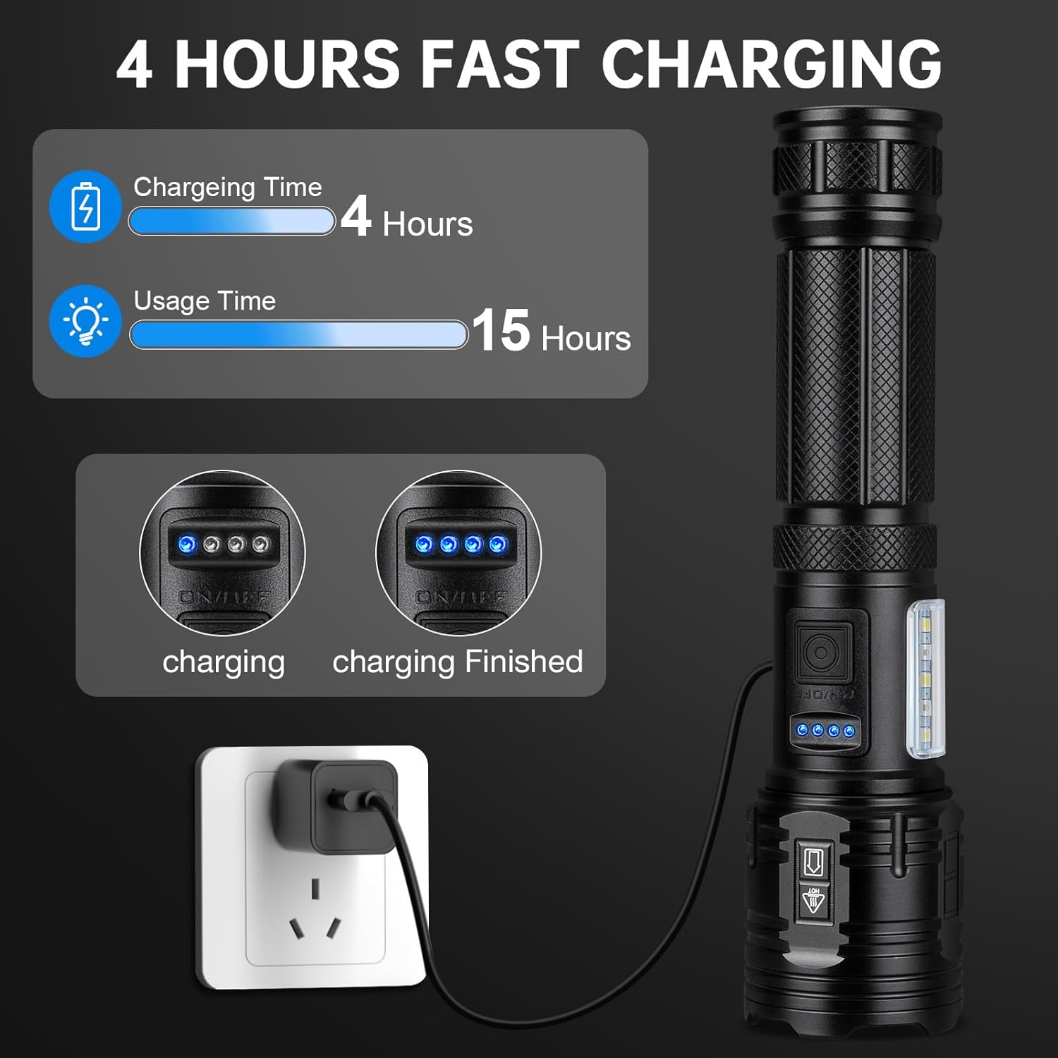 Fast Charging|Power Indicator – 4 hours faster charging. Rechargeable flashlights equipped with intelligent charging interface, charging efficiency increased by more than 30%, and over-voltage, over-current protection.4 power indicator (25%, 50%, 75%, 100).