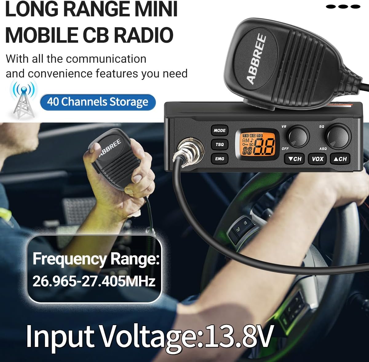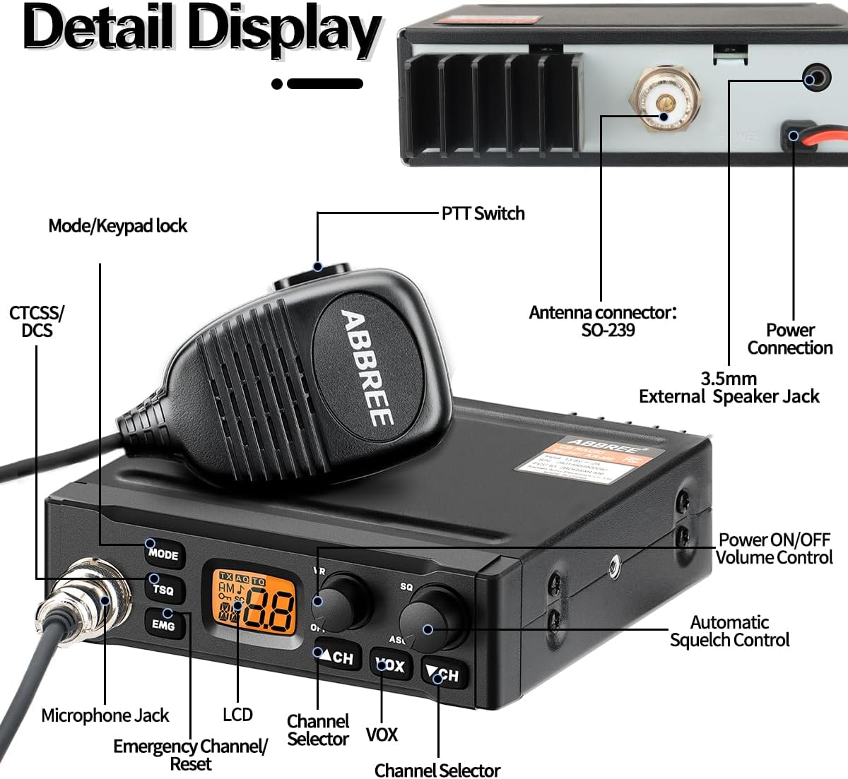 Multifunctional:4Watts Output,13.8V Input,40 Channels Operation,38CTCSS&104DCS,26.965-27.405MHz frequency range,Orange Backlit LCD Display,VOX Function,AM/FM Dual Mod,ASQ/SQ Control,Keypad Lock,Full Channel Scan,Emergency Radio.