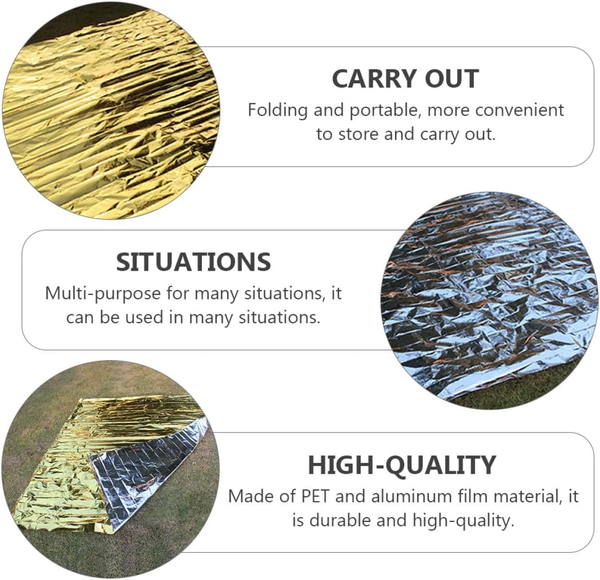 – Folding and portable, more convenient to store and carry out camping emergency blankets.