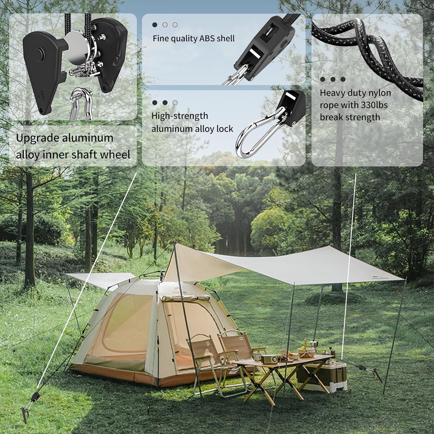 Effortless Pulley System – No Knots Required – Forget frustrating knots; our rope with hook system makes setup a breeze. Featuring internal aluminum alloy gears and a smooth-gliding pulley, you can achieve the perfect tension in seconds. Simply secure the heavy-duty carabiner clips to your tent stakes, tarp, or gear and pull. This ratchet rope system provides a secure lock every time, making it the most user-friendly tie down strap for kayaks, canoes, and emergency shelters.