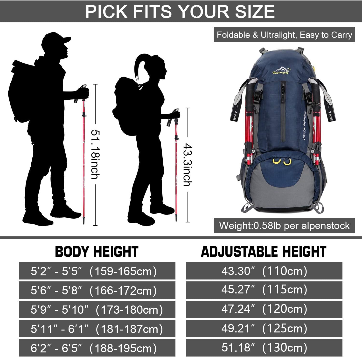 Sturad and Durable Material:These Collapsible trekking Poles are built with incredibly lightweight and durable aircraft-grade aluminum. Tough enough to handle the steepest slopes, rocky terrain and frigid temperatures, yet light enough to take every challenge in stride