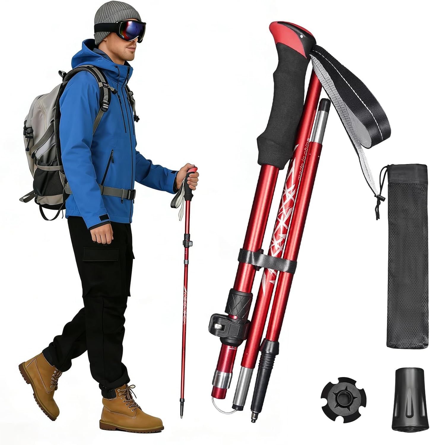 Complete Trail-Ready Kit: 1 * hiking pole, 1 * rubber foot covers, 1 * detachable snow support, and 1 * packaging bag. Weighing only about 0.55 lbs (250g) per pole, it is exceptionally easy to carry.