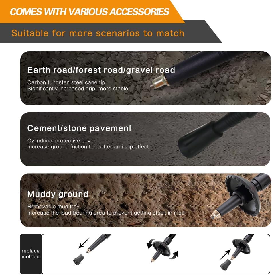 【Comfortable Grip, No Fatigue Even After Long Use】EVA grip is sweat-absorbent and anti-slip, keeping hands from feeling stuffy in summer or cold in winter. Adjustable wrist straps reduce hand pressure, so your arms stay comfortable even during extended use. Includes replaceable tips and snow baskets for stable footing on rocky terrain, grass, or snow.