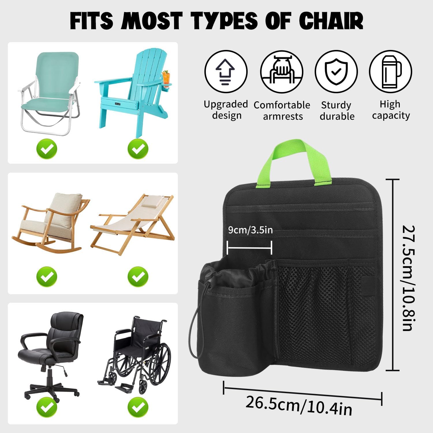 💺【Fit for All Armchairs】The fabric on the back is adjustable to fit most standard size chair armrests; such as beach chairs, lawn chairs, camping chairs, recliners, wheelchairs and office chairs, etc. Bringing ease and convenience to your life