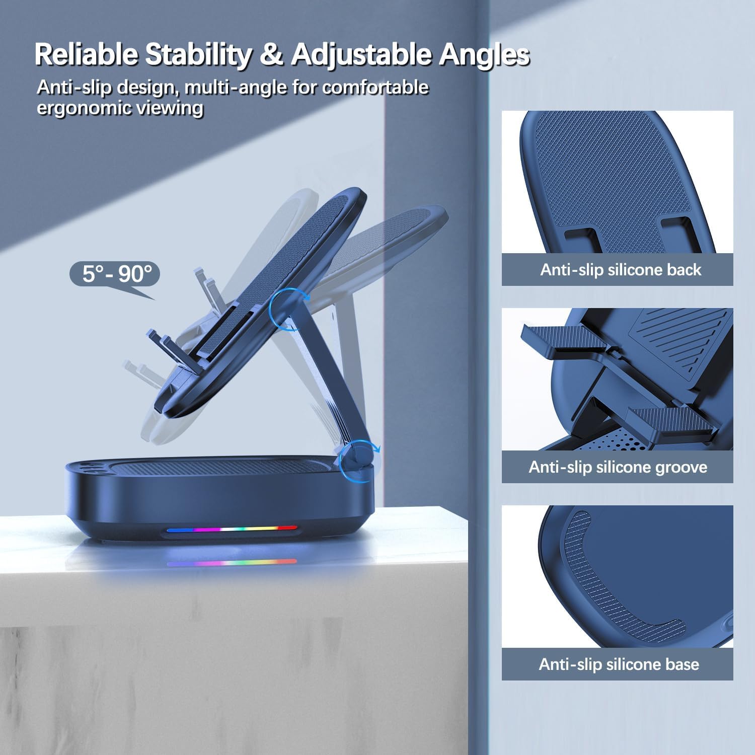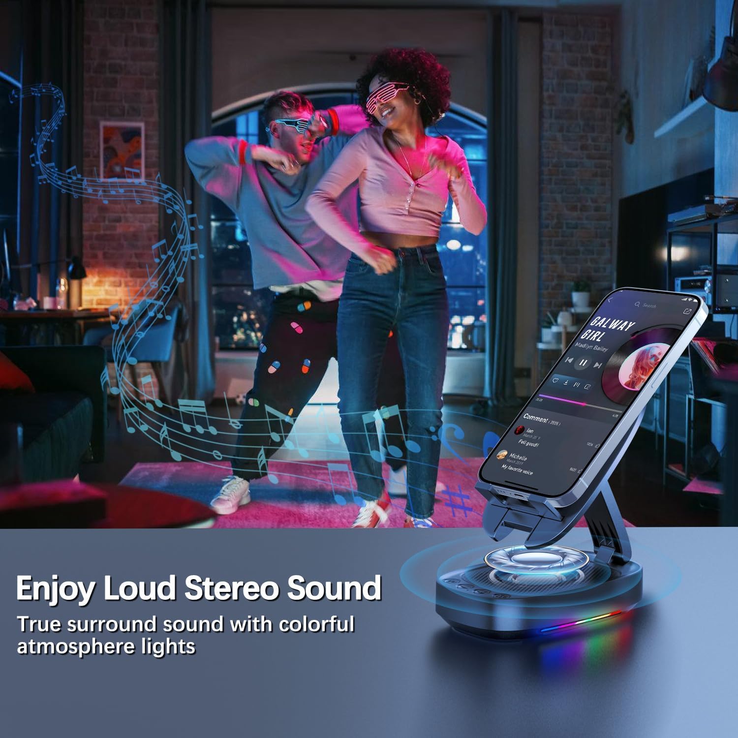 Phone Holder Portable Bluetooth Speaker: Built in the latest Bluetooth 5.0 chip, the cell phone stand with Bluetooth speaker ensures fast pairing and a stable connection. Enjoy enhanced sound performance thanks to 5W stereo speakers and a passive subwoofer for richer bass.