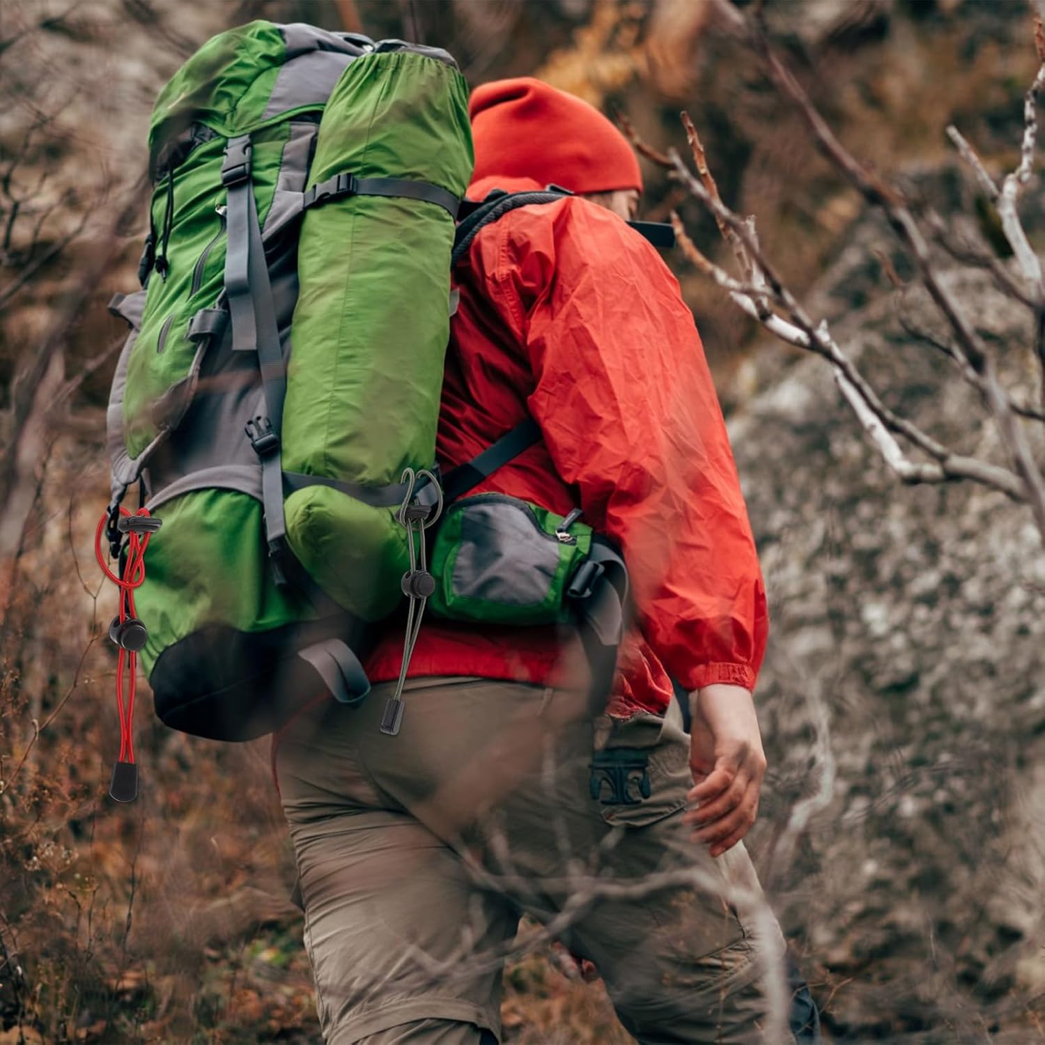 Color Strategy: Elevate your gear with green, black, and red backpack bungee straps. Seamlessly coordinate with your pack or stand out safely in the wild