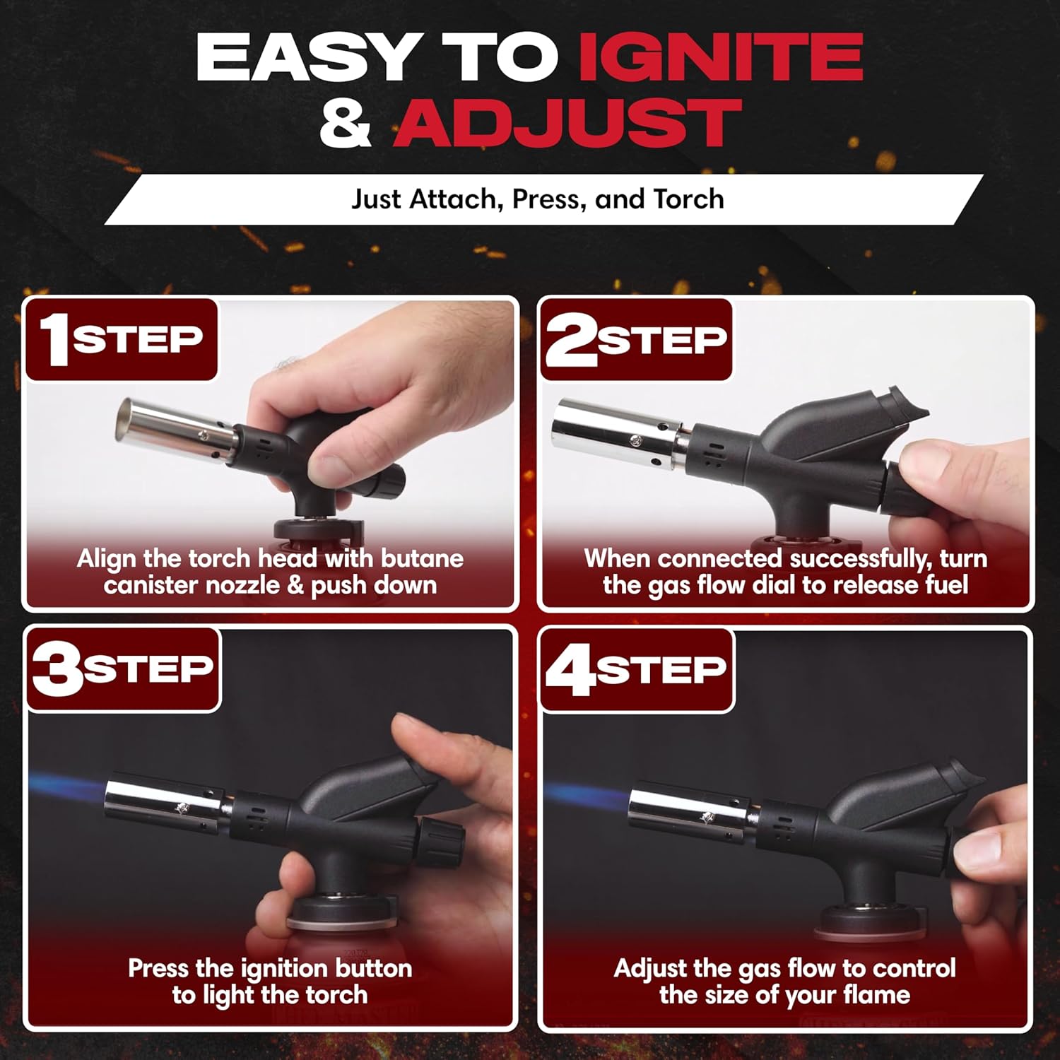 LONG-LASTING PERFORMANCE – Engineered for extended use, the butane lighter torch offers up to 3 hours of continuous burn time with a standard 8 oz. canister. Our blow torch lighter is perfect for commercial kitchens, catering, or outdoor cooking where consistent, long-duration performance is critical.