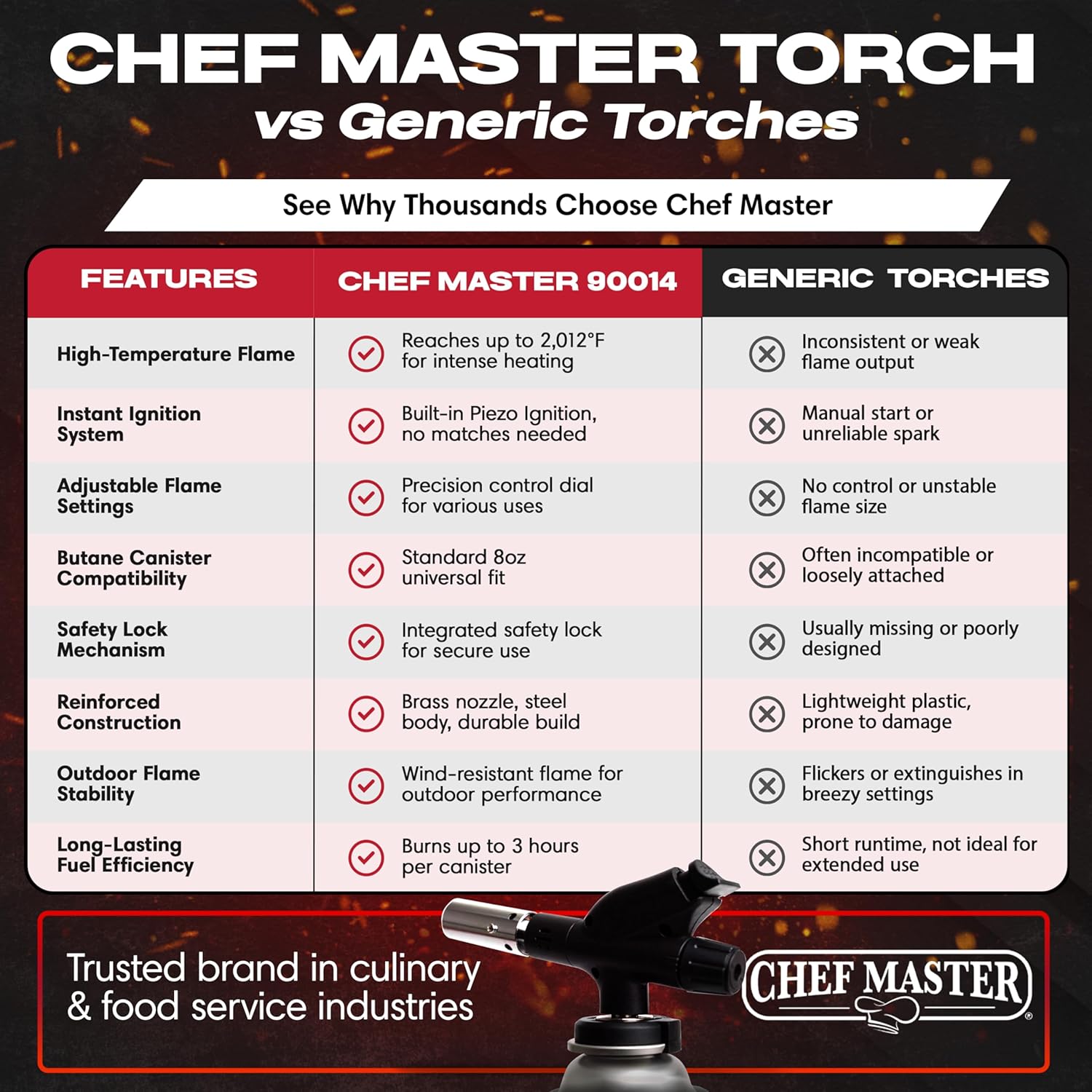 POWERFUL HEAT OUTPUT – Compact yet mighty, the Chef Master kitchen torch gun delivers 4,220 BTUs and a maximum flame temperature of 2,012°F. This power makes the cooking torch gun ideal for searing proteins, charring vegetables, or achieving precise high-heat finishes with speed and accuracy.