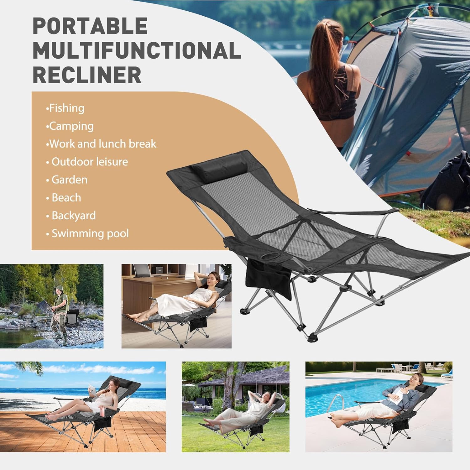 RECLINING DESIGN: Our camping chair offers comfort and versatility with adjustable reclining design, featuring a smooth lever mechanism that allows for seamless transitions from an upright position (90°) to a full recline (130°). The footrest provides perfect leg support, whether you’re sunbathing at the beach or stargazing at the campsite. Unlike other chairs that only recline slightly, our heavy-duty frame remains stable in full-lounge mode—no wobbling or tipping!
