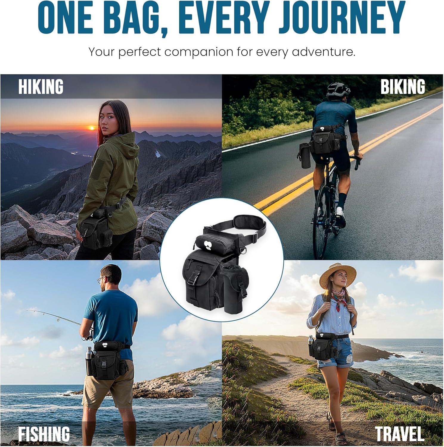 𝐈𝐍𝐍𝐎𝐕𝐀𝐓𝐈𝐎𝐍 𝐃𝐄𝐒𝐈𝐆𝐍 𝐅𝐄𝐀𝐓𝐔𝐑𝐄𝐒: Our Drop leg Tactical Bag combines practical design and modern style, fitting securely on our leg or crossbody. It is an adjustable strap for effortless wear, ensuring hands-free convenience. This bag’s insulated bottle pouch keeps beverages at perfect temperatures during adventures, making it ideal for hiking, biking, or travel.