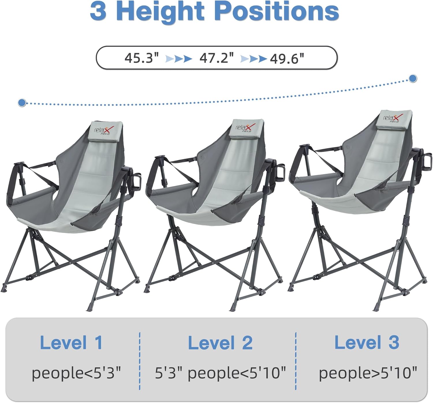 3 Position Heights: Our Camping chair features 3 position height adjustment to accommodate adventurers of all sizes of user heights, allowing you to sway in the wild without long ropes and trees