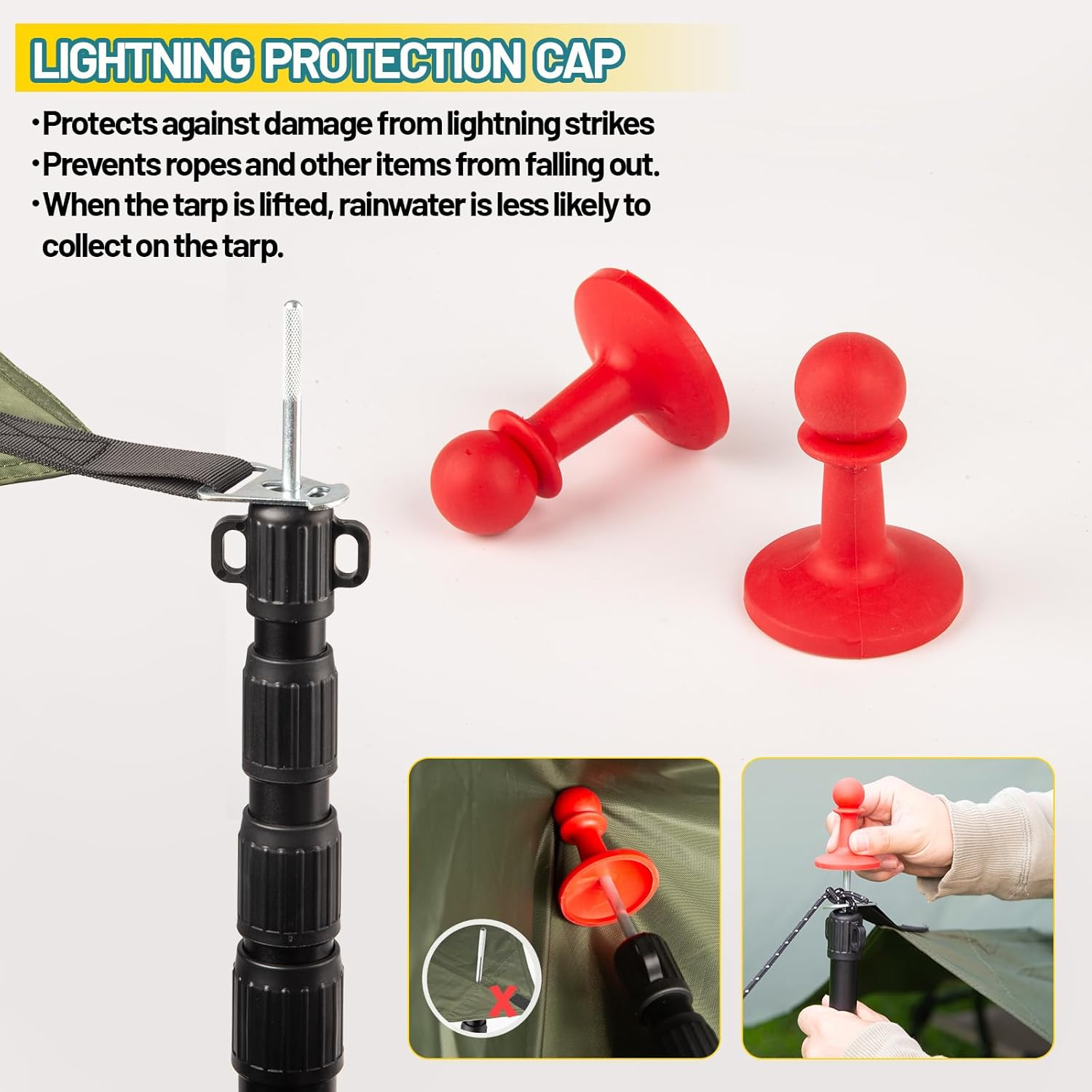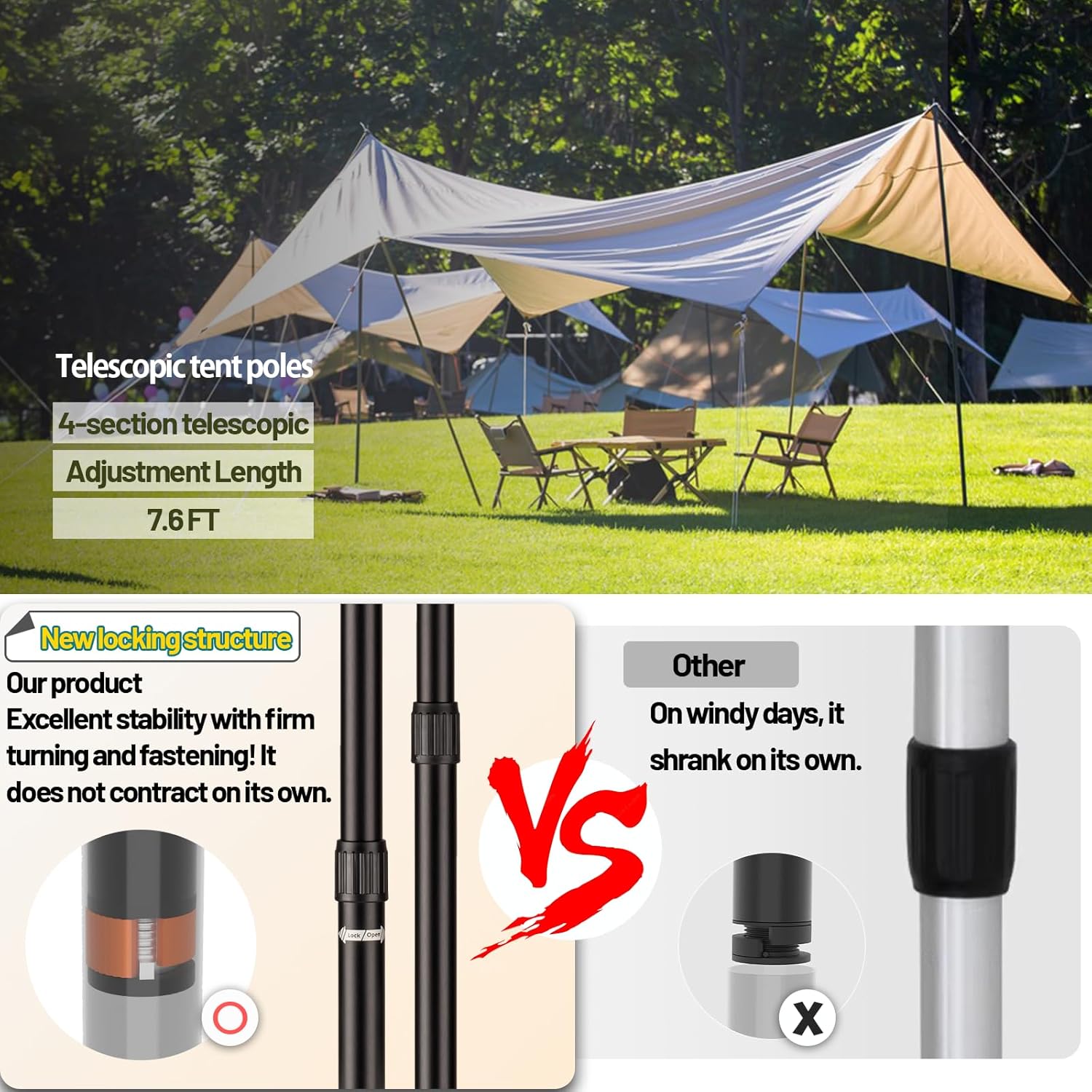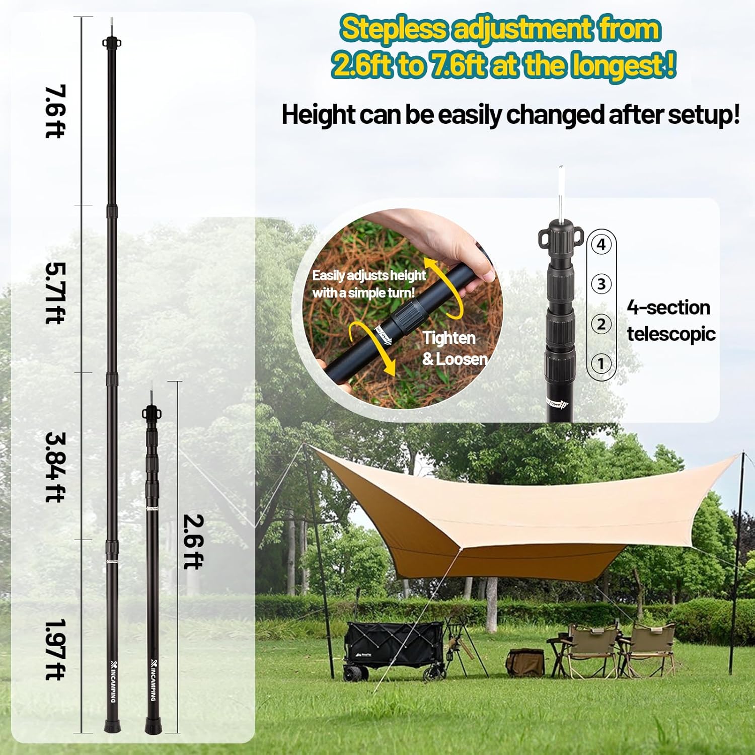 4-Section Adjustable Design – Tarp poles easily extend from 2.6ft (portable) to 7.6ft (maximum height) for tents, sunshades, gazebos and outdoor shelters.
