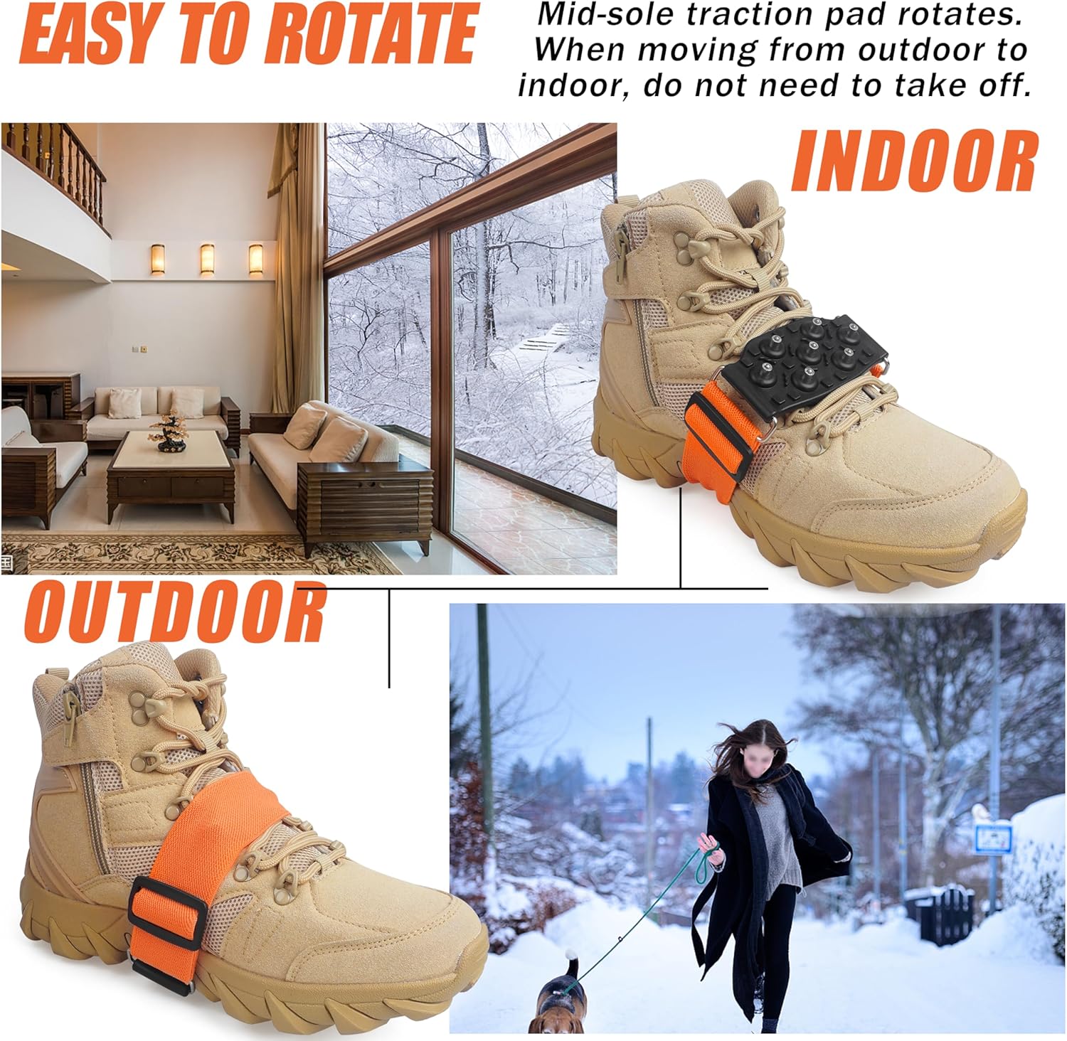 【BOTH INDOOR & OUTDOOR】 The ice cleats doesn’t need to be taken off, rotates the studs cleats to top of foot when indoor, driving, climbing, etc
