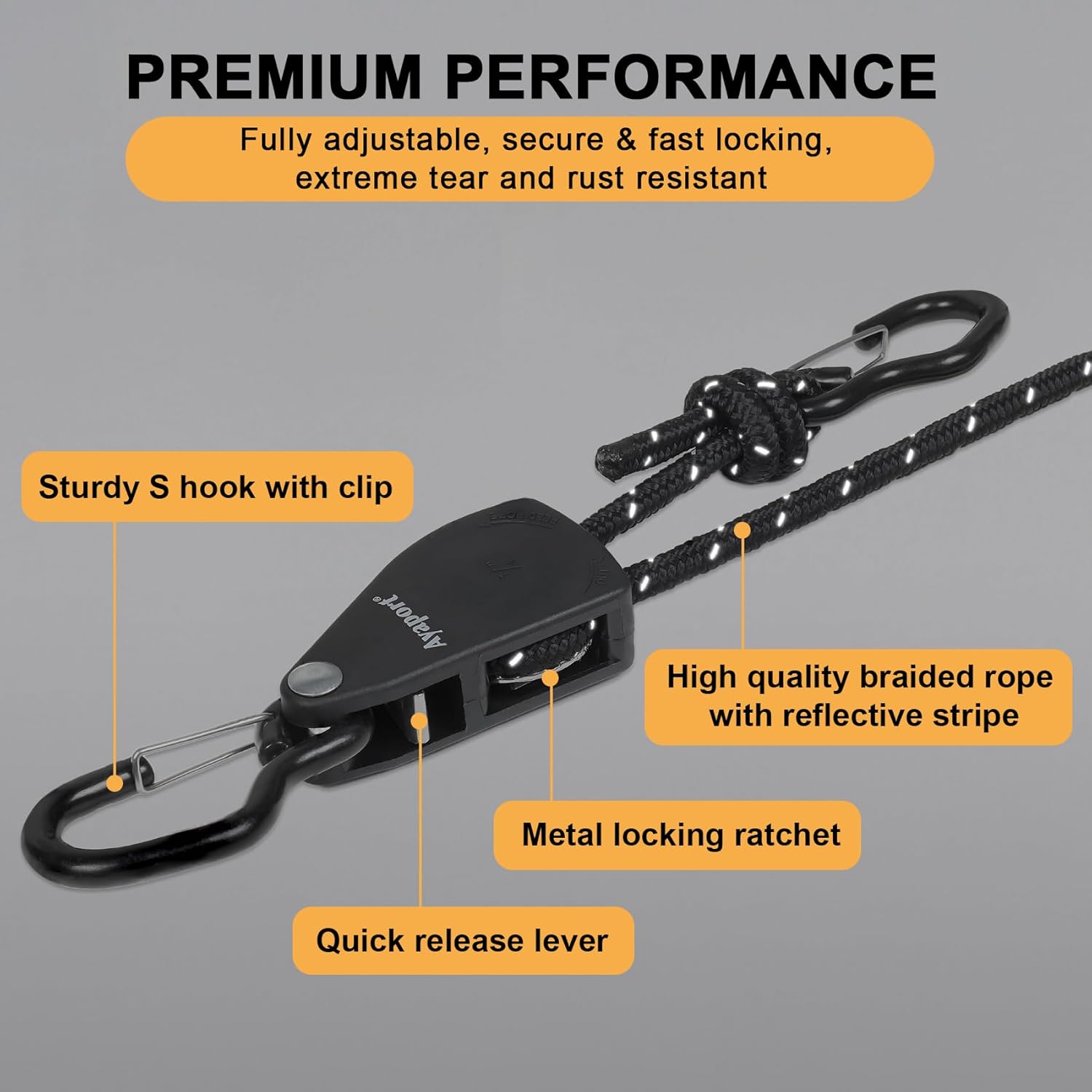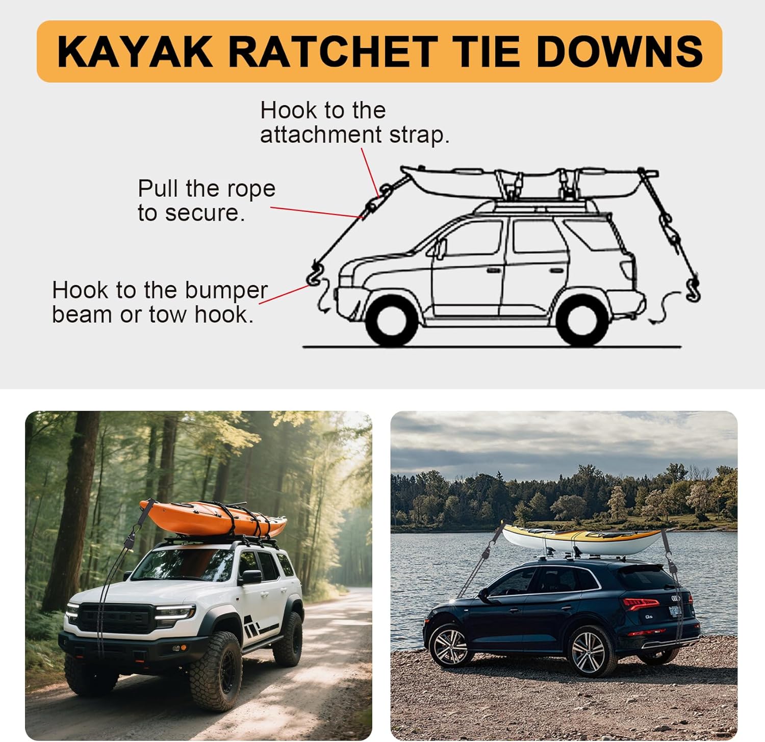 FOR ALL YOUR TIE-DOWN NEEDS: This versatile ratchet rope tie down allows you to secure various loads quickly and easily. Ideal for camping, kayaking, boating, and yard work. Ayaport kayak straps keep your watercraft firmly in place on roof racks, ensuring a safe and worry-free journey