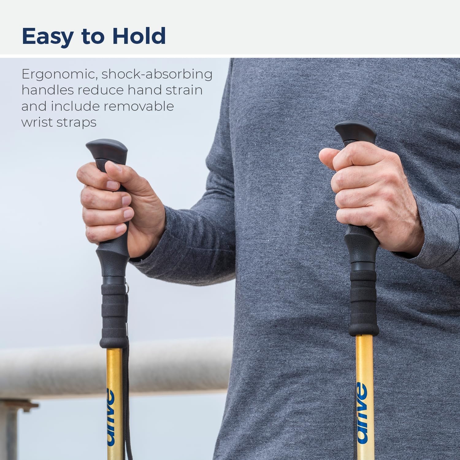 Ergonomic Handles: Trekking poles are capped with shock-absorbing handles shaped for comfort and include a wrist strap for added security
