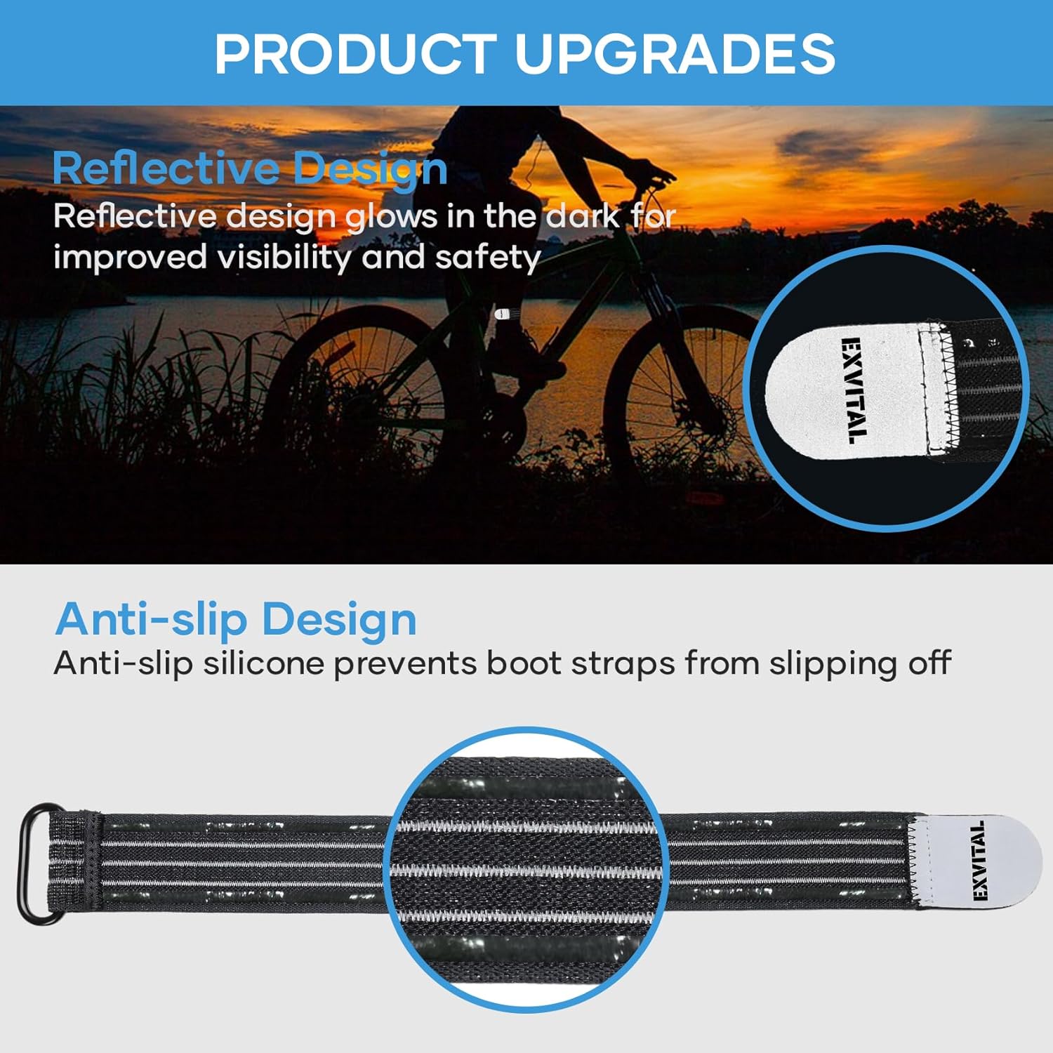 UPGRADED ANTI-SLIP AND REFLECTIVE DESIGN. We have added a new anti-slip and reflective design to our regular boot straps. The anti-slip silicon will make the straps fit tightly and not easy to slip off. The reflective design will glow in the dark for improved visibility and safety