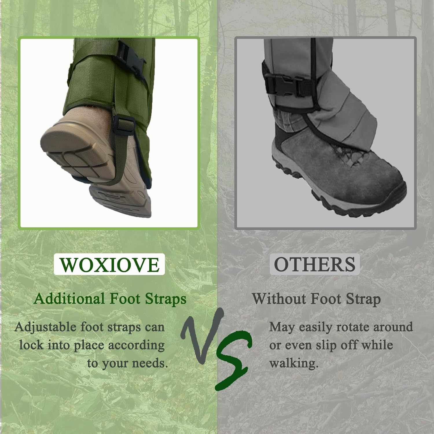 Secure Hunting Gear: Equipped with a adjustable secure foot strap, the gaiters for hiking ensure a snug fit around your legs and shoes, preventing any unwanted slippage or rotation during movement