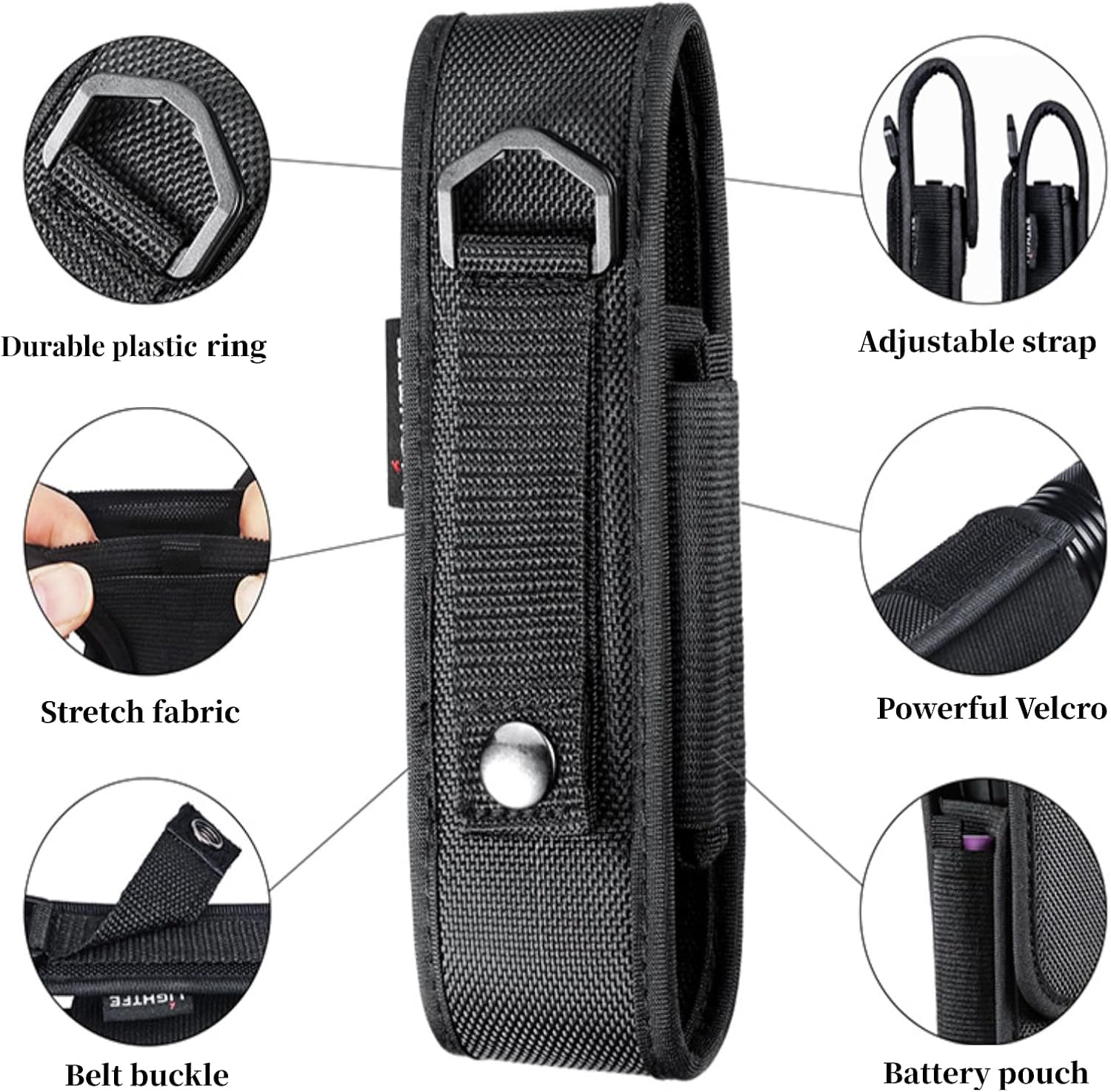 【Portable design】The flashlight Pouch comes with a side pocket made of highly elastic material that can be used to carry batteries ( batteries are not include ), full top flap with high strong and three buttons helps secure canister, not easy to get caught or flip open
