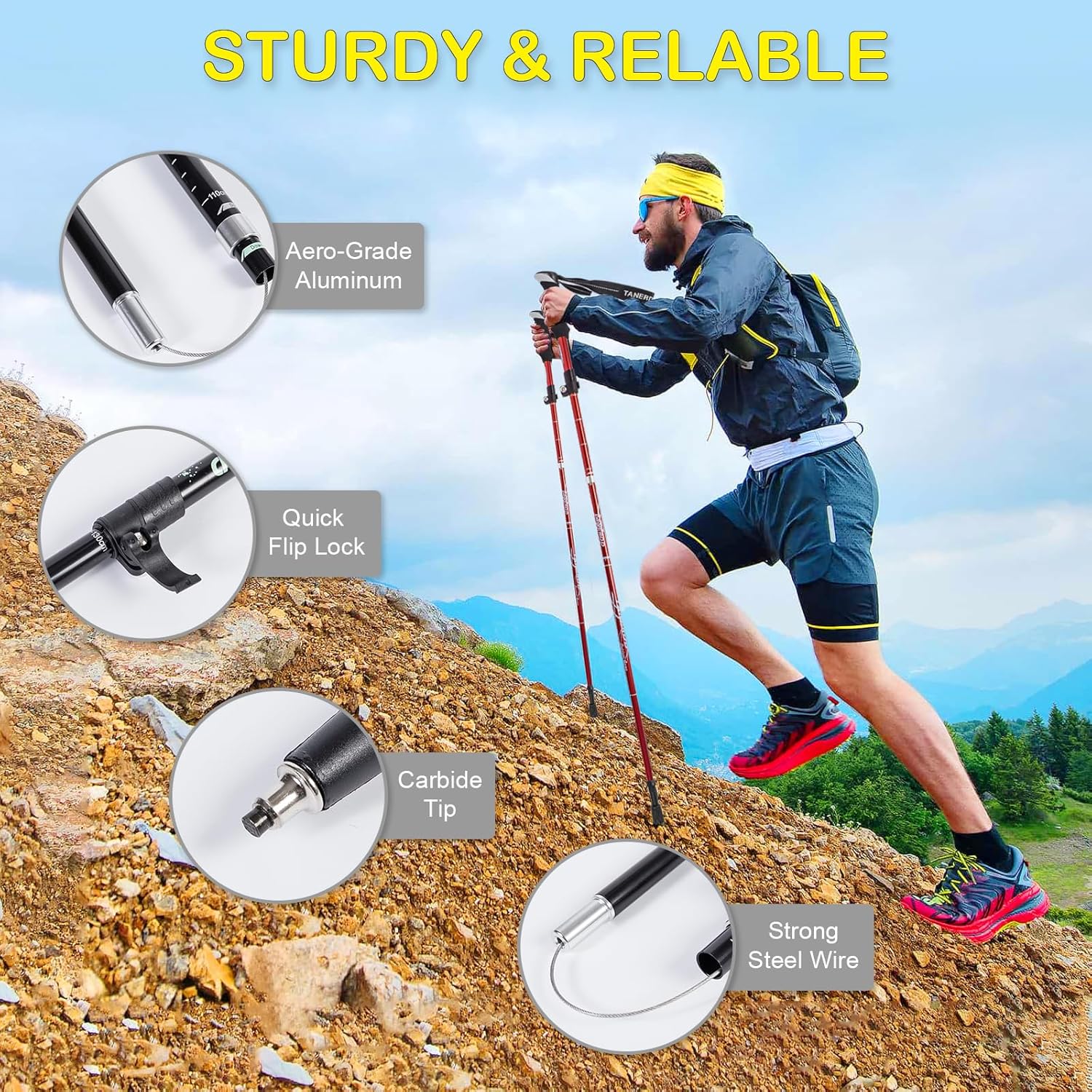 【STRONGER AND LIGHTER THAN CARBON FIBER】-Our Trekking poles made with high quality Aluminum that won’t disappoint you on sand, rocks, pavement, on the trail, in the stream or on any other surface. suitable for outdoor Hiking and walking .The inclusion of ultra-strong steel wire ropes adds an extra layer of toughness, making them resilient and less prone to breakage.