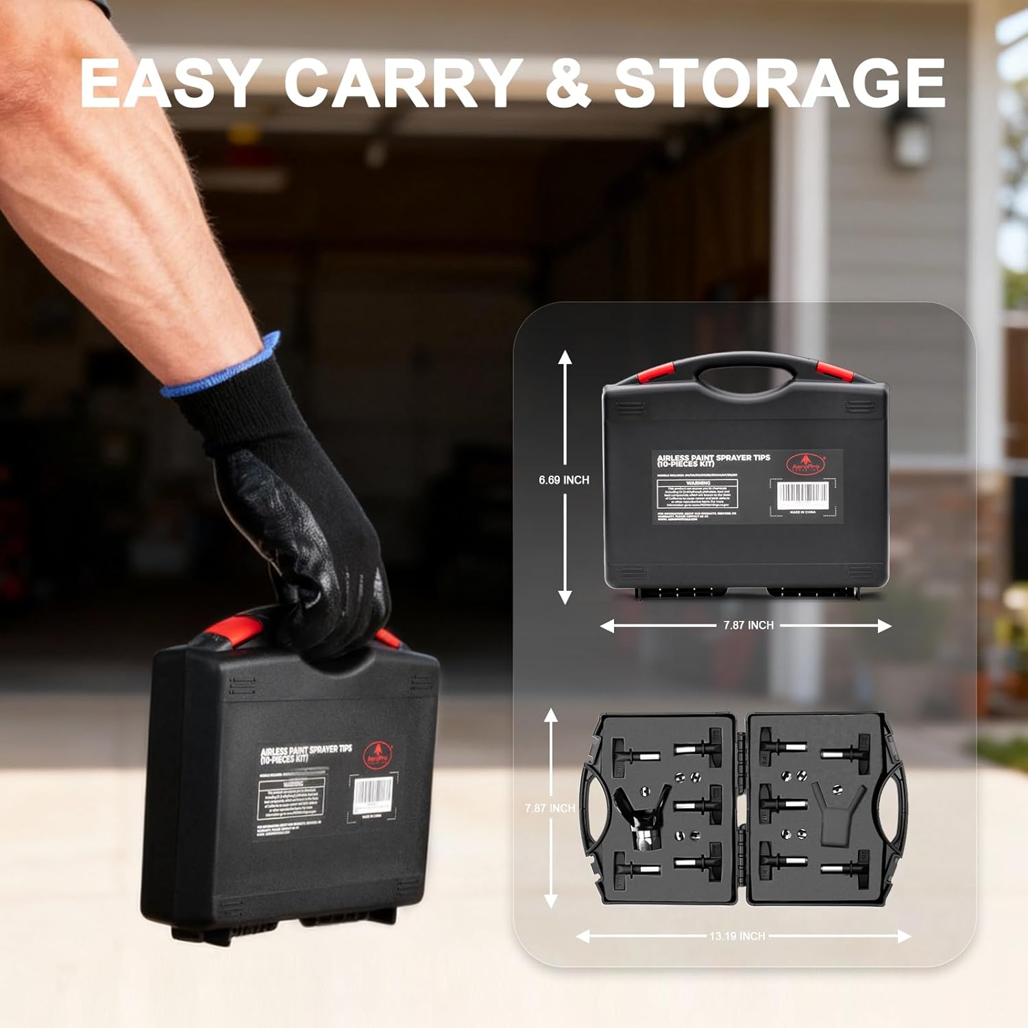 12-Piece Airless Spray Tips Set-Includes 10 reversible tips, 1 tip guard, and 1 sturdy storage case. This all-in-one kit is perfect for your daily painting needs and easy replacements.