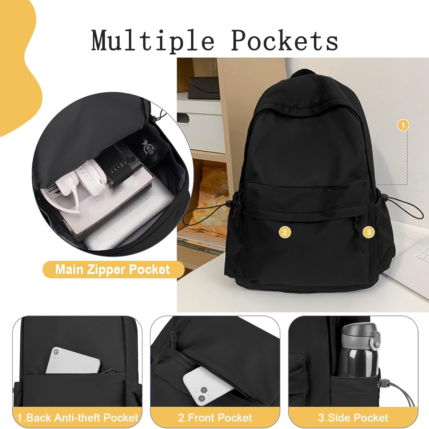 【Large Capacity】Designed for versatility, this large-capacity college backpack integrates multiple compartments to organize essentials efficiently. It can effortlessly hold mobile phones, computers, cameras, water glasses, clothes, wallets, and umbrellas.