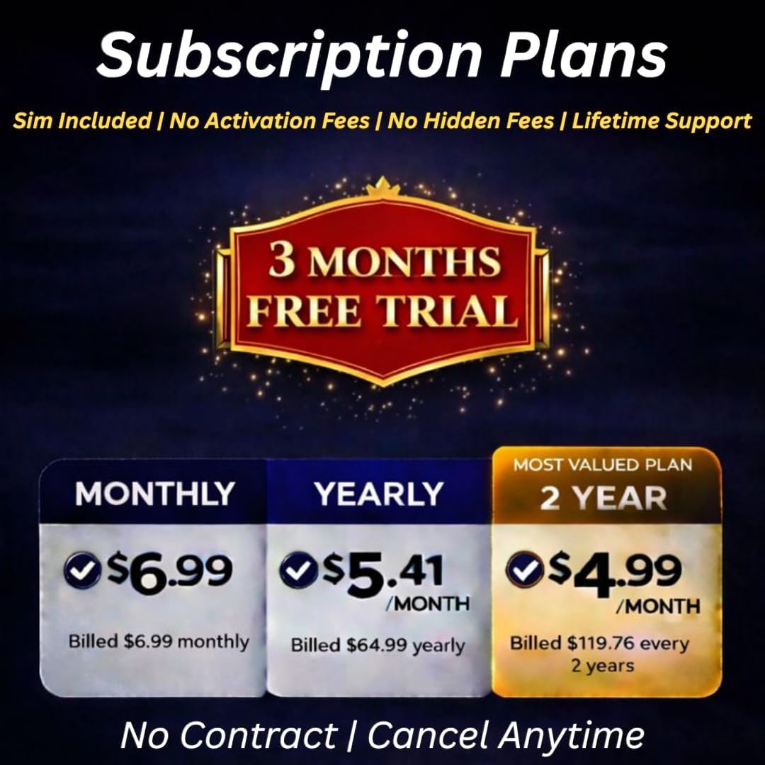 Flexible Subscription Plans with Three Months Free Trial – No Contracts, Cancel anytime. Monthly ($6.99), Yearly ($5.41), and 2-Year ($4.99) plans available. SIM card and activation included for instant setup.