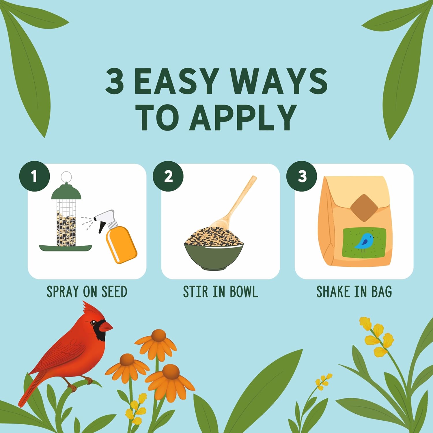 Ready to Use – No Dilution Required: Just shake, pour or spray, and stir. One ounce treats 3 – 5 lbs of bird seed.
