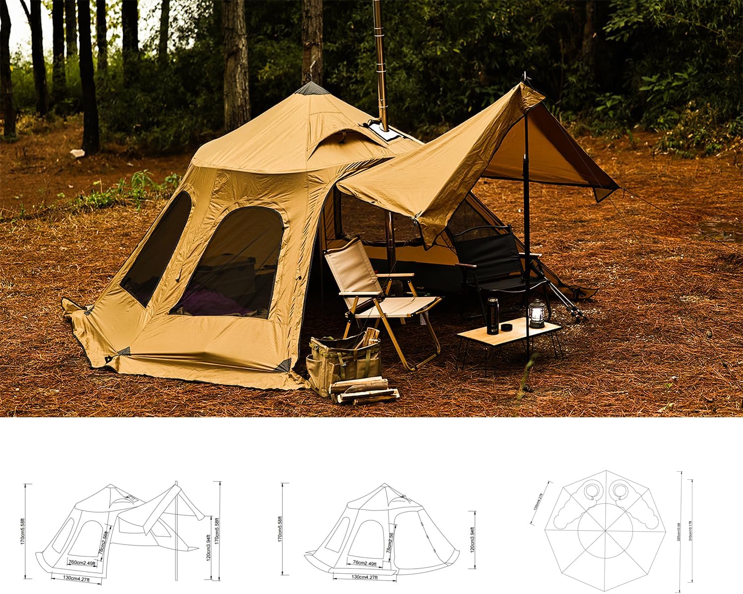 【Large Internal Space】The internal space capacity of the Bell-Shaped hot tent is large, and the unfolded size is 10.5×10.17×5.58ft / 3.2×3.1×1.7m (L×W×H). The horizontal aluminum alloy ring on the top of the tent greatly enhances the top space, and compared to traditional tipi tents (same height), the internal space utilization has been greatly improved. It can accommodate 1-2 people at the same time, very suitable for family outdoor camping life.