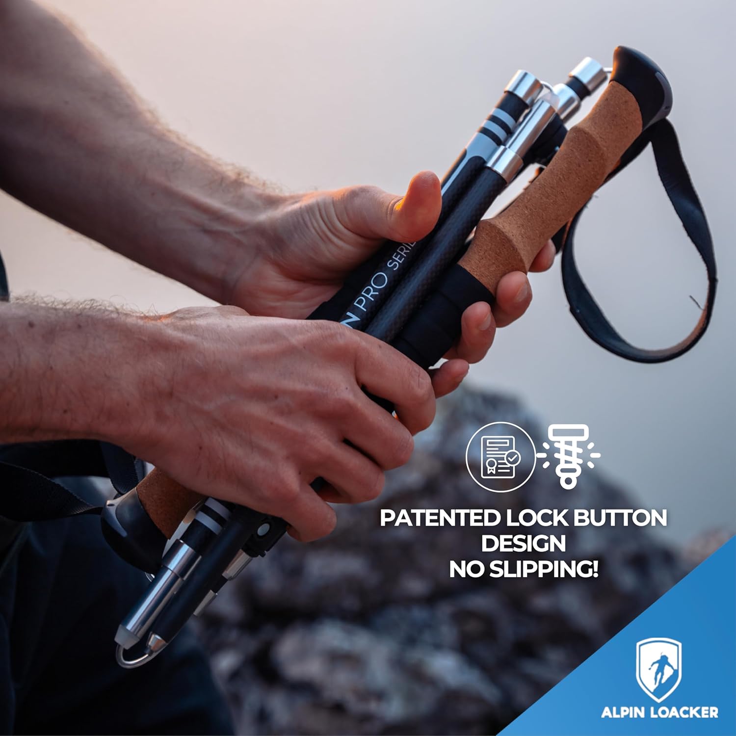 Our hiking poles feature a patented lock button that prevents foldable poles from collapsing, ensuring maximum safety and reliability on every trail.