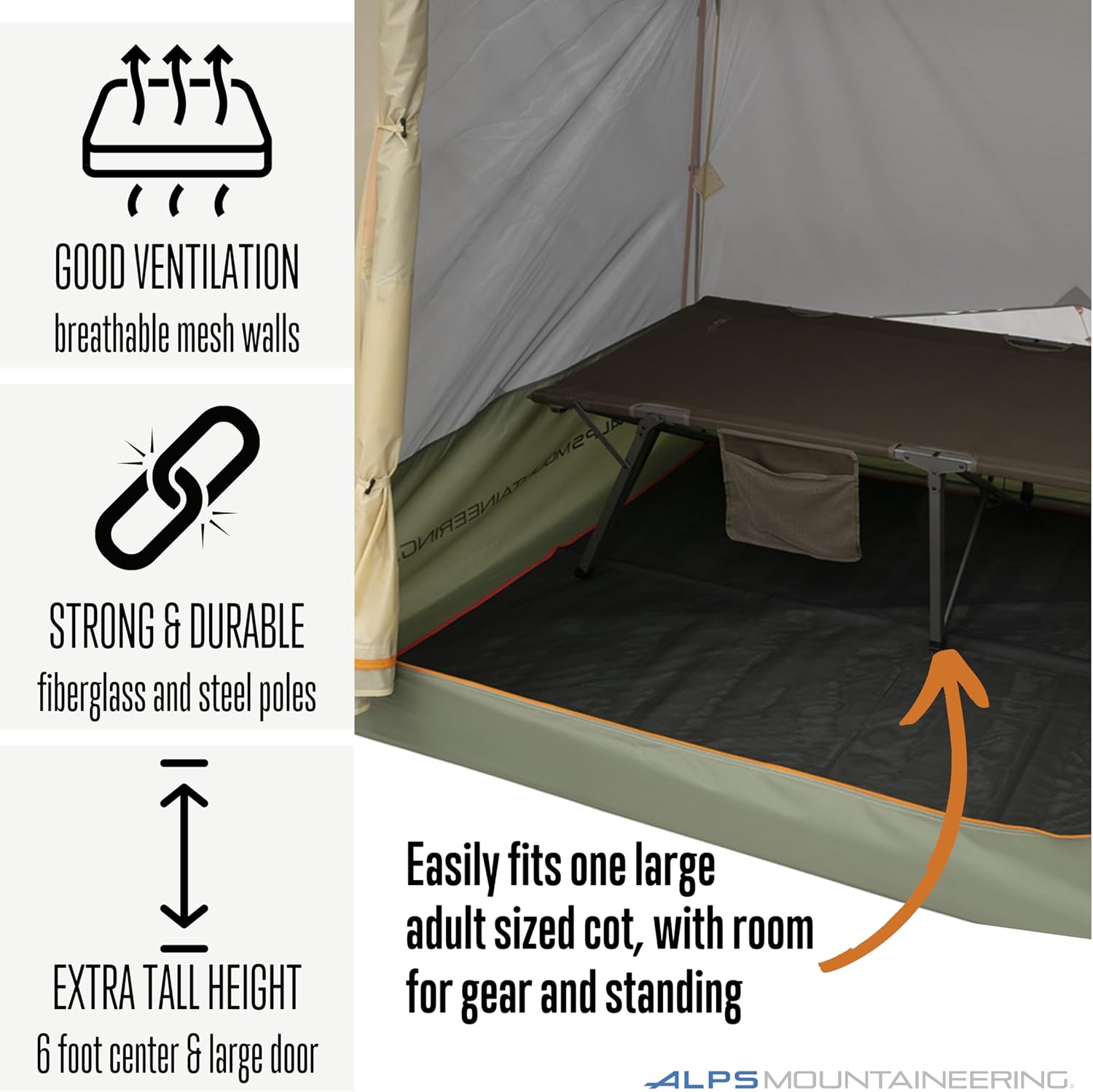 Spacious and Purpose-Built for Solo Camping with a Large Cot: Vertical sidewalls maximize interior room, allowing for a more comfortable sleeping and lounging experience; 6 foot center height and 41 square feet of tent area