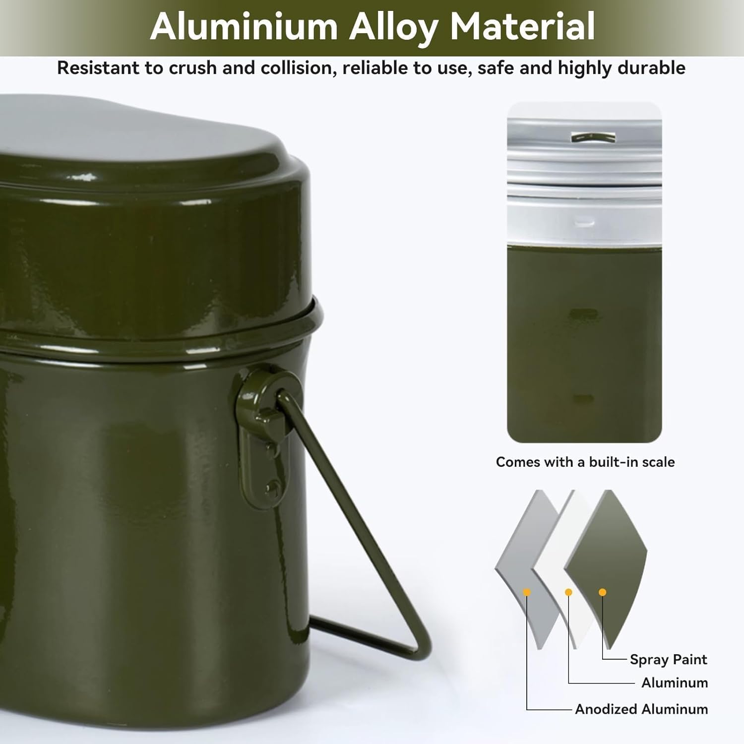 [Aluminium Alloy Material]: This military mess tin adopts aluminium alloy material, resistant to crush and collision, reliable to use, safe and highly durable. Lightweight and extremely durable anodized aluminum perfect for camping backpacking, aluminum pot and frying pan make it non-stick ,easy to clean