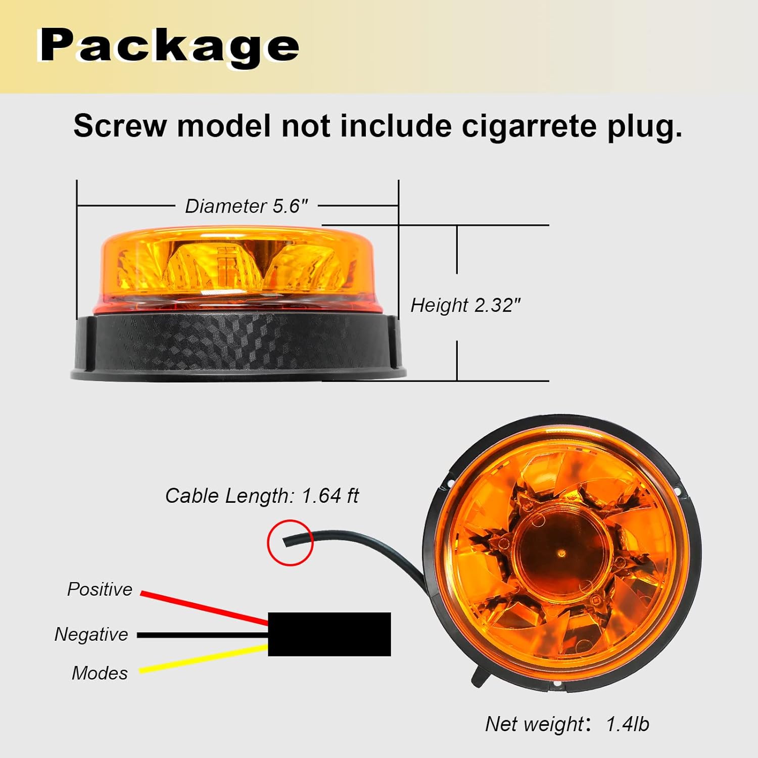 Power 16W Operating Volt DC 12/24V Color Amber(590nm~595nm) Flashing Modes 6 modes Working Temp -40 ~ 65 °C Dimension D 5.6″ x H 2.3″ N.W. 0.55lbs Protection Rating IP67 Material ABS Base, PC Lens. Lifespan Over 50000 hrs Wire 1.6ft cable (plug not include) Certified SAE J845, ECE R65, ECE R10, CE & RoHs