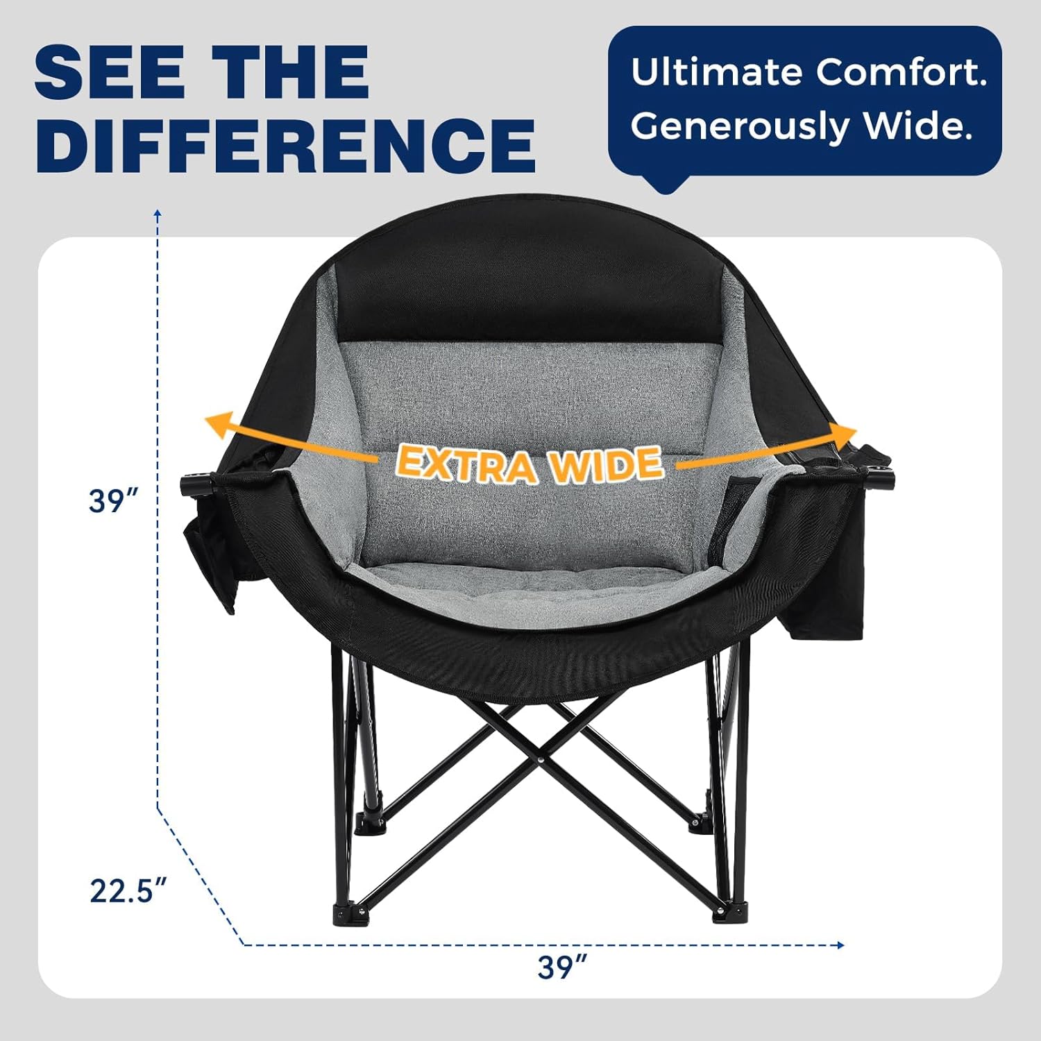 Extra-Wide & Padded Comfort — Designed with ergonomic support in mind, this comfy camping chair is padded with thick cushioning in the seat, backrest, and headrest. The xl camping chair design comfortably fits various body types, offering a plus size camping chair experience that keeps you relaxed during extended outings.