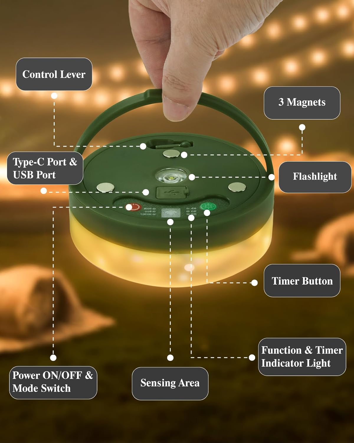 3 Adjustable Brightness & 6 Light Modes: It features 3 levels of adjustable brightness and 6 light modes (Constant On, Flash, Breathing Flash, SOS Flash, String Light + Lamp Light Constant On, Flashlight) to meet different needs Mobile Charging on the Go: Keep your devices powered up with the built-in USB port, allowing you to charge your phone or other gadgets directly from the camping light.