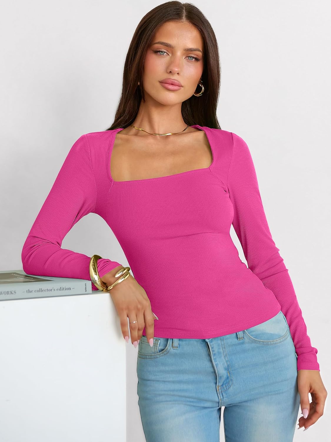 The video showcases the product in use.The video guides you through product setup.The video compares multiple products.The video shows the product being unpacked. Women Long Sleeve Square Neck Ribbed Slim Fit Top Merchant Video