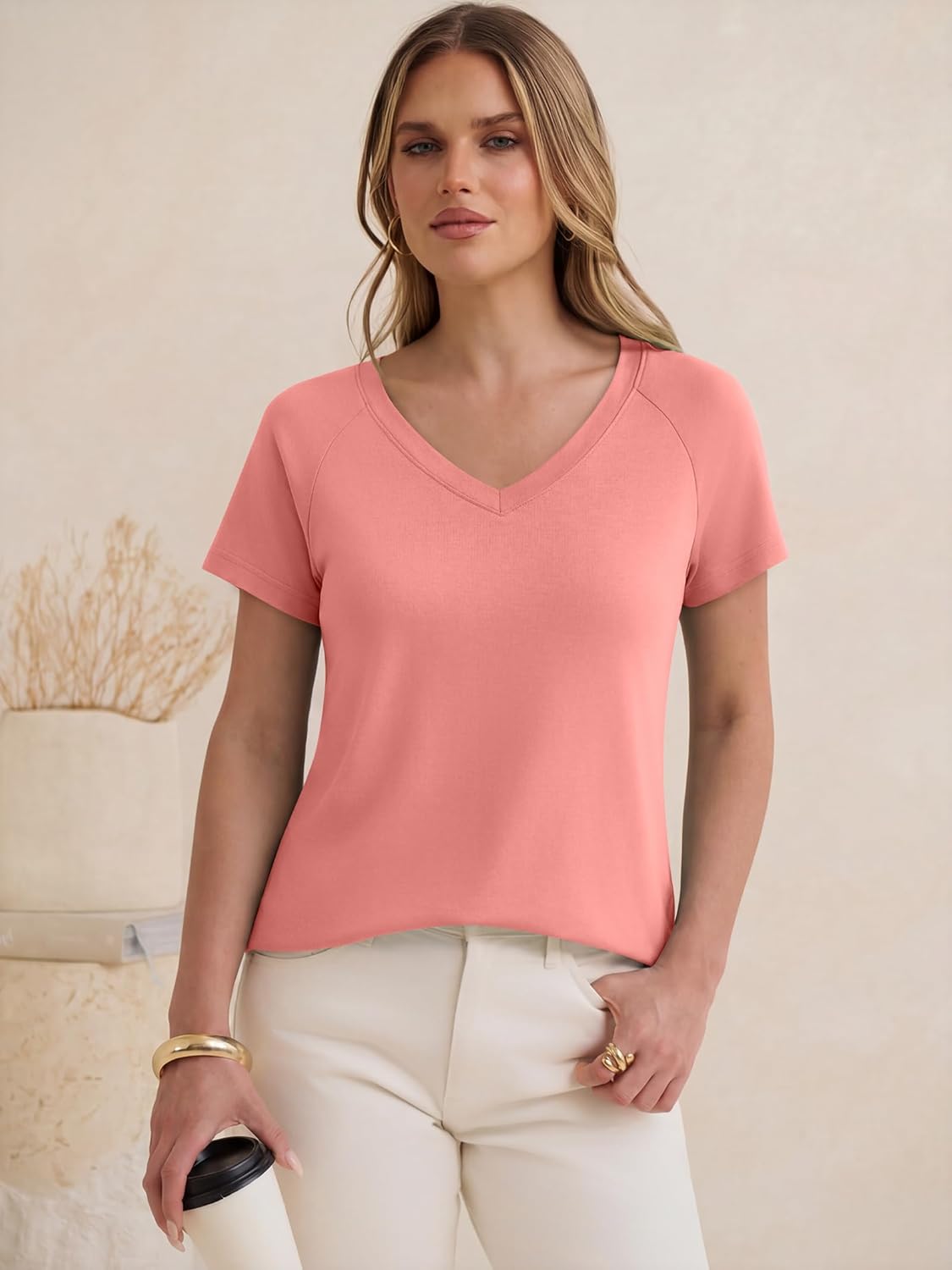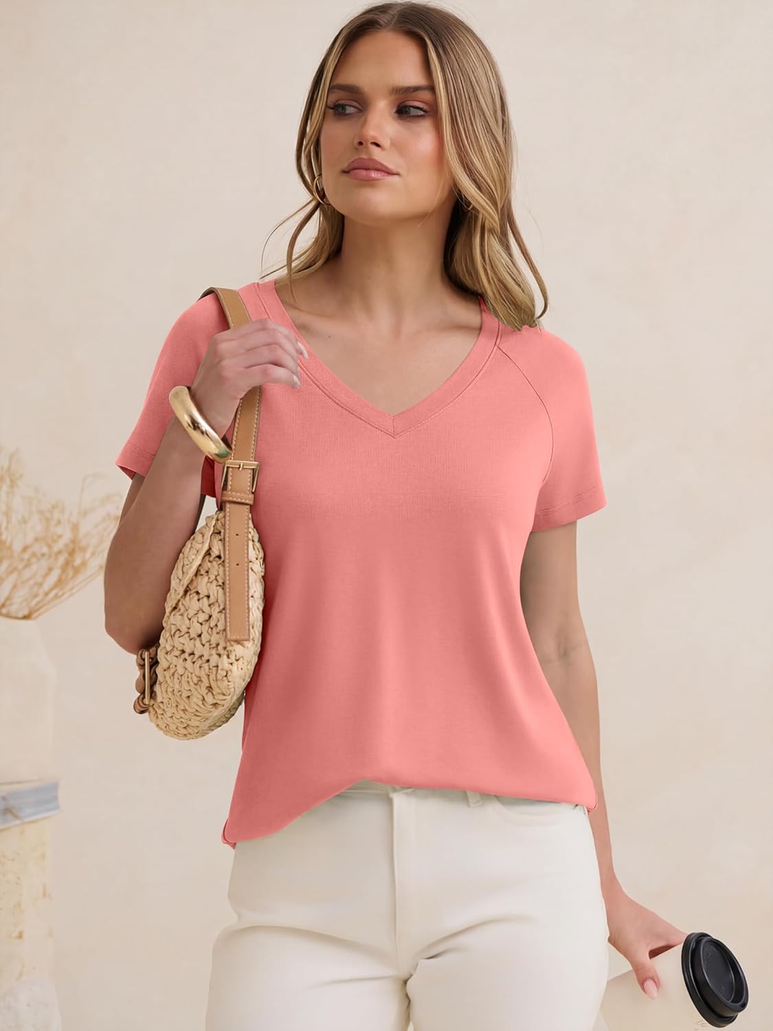 The video showcases the product in use.The video guides you through product setup.The video compares multiple products.The video shows the product being unpacked. Womens Tops Short Sleeve V Neck Shirts Merchant Video