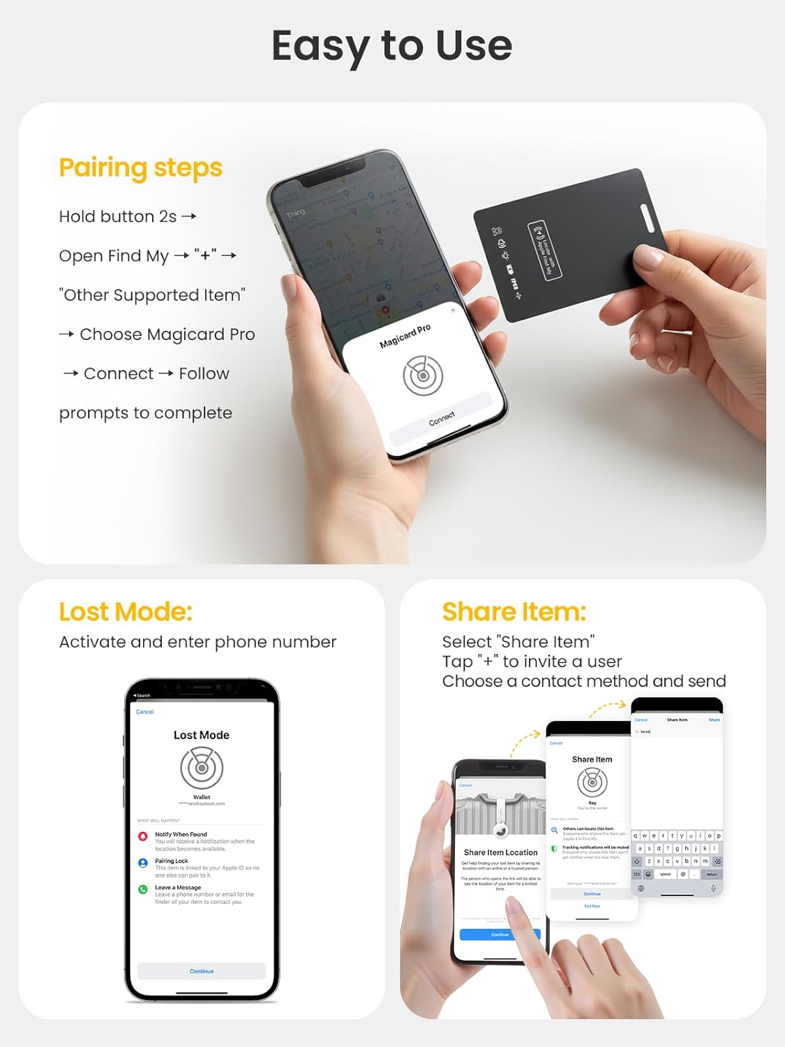 【Smart Alerts, Lost Mode & Family Sharing】: Get instant Leave Behind Alerts when your wallet moves out of range. Activate Lost Mode to enlist Apple’s secure Find My network for updates if it’s misplaced. With iOS 17, you can share item locations with up to five people—perfect for shared travel gear or family use