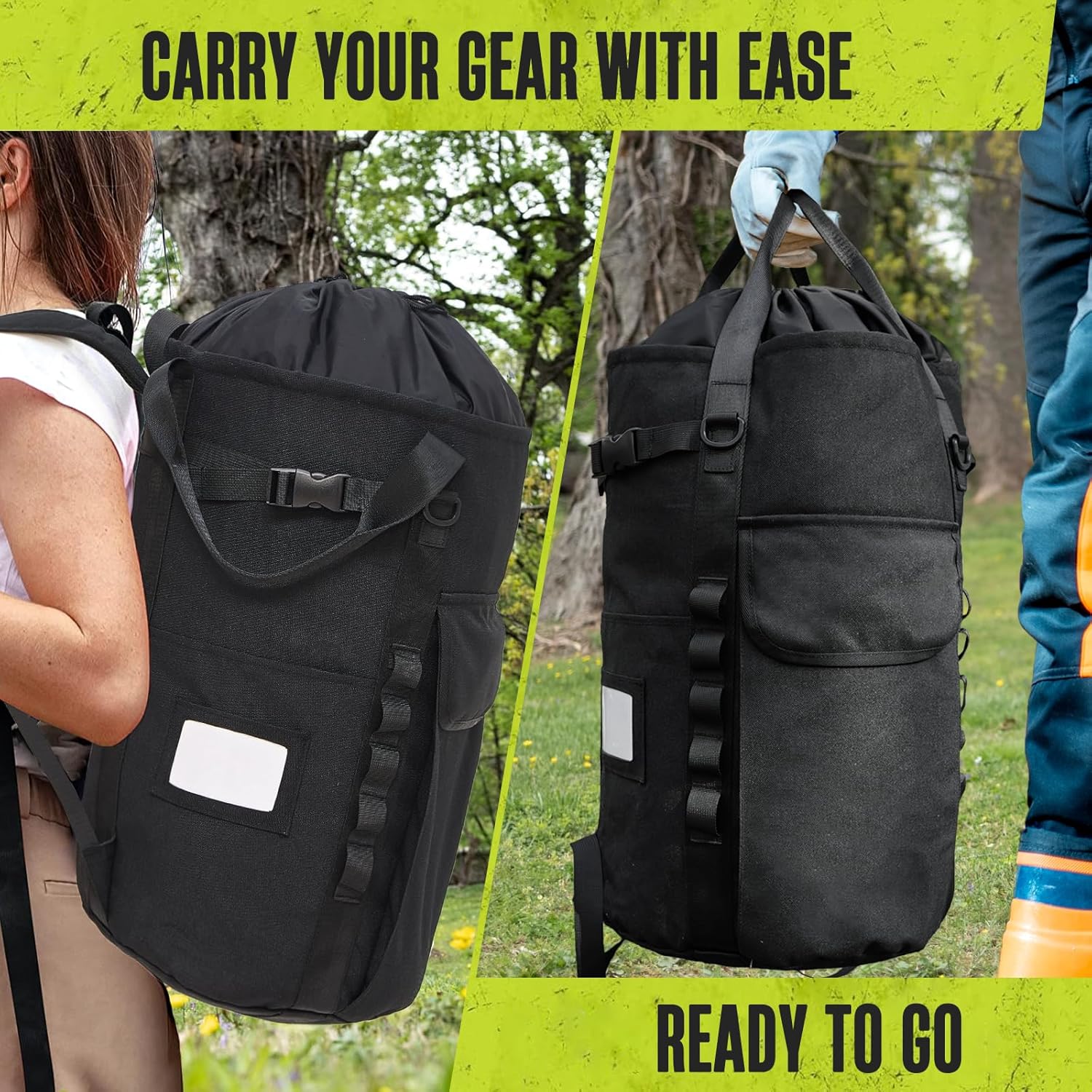 Organize and Carry Your Gear with Ease: With two rows of daisy chains and D-rings on the front, this arborist gear carrier bag lets you easily organize carabiners, biners, tools, or extra gear; Interior tie-off loops keep your rope ends neatly secured, keeping everything organized and ready for use; Plus, carry it however you prefer—side handles and adjustable backpack straps make it easy to transport on those long walks back to your job site