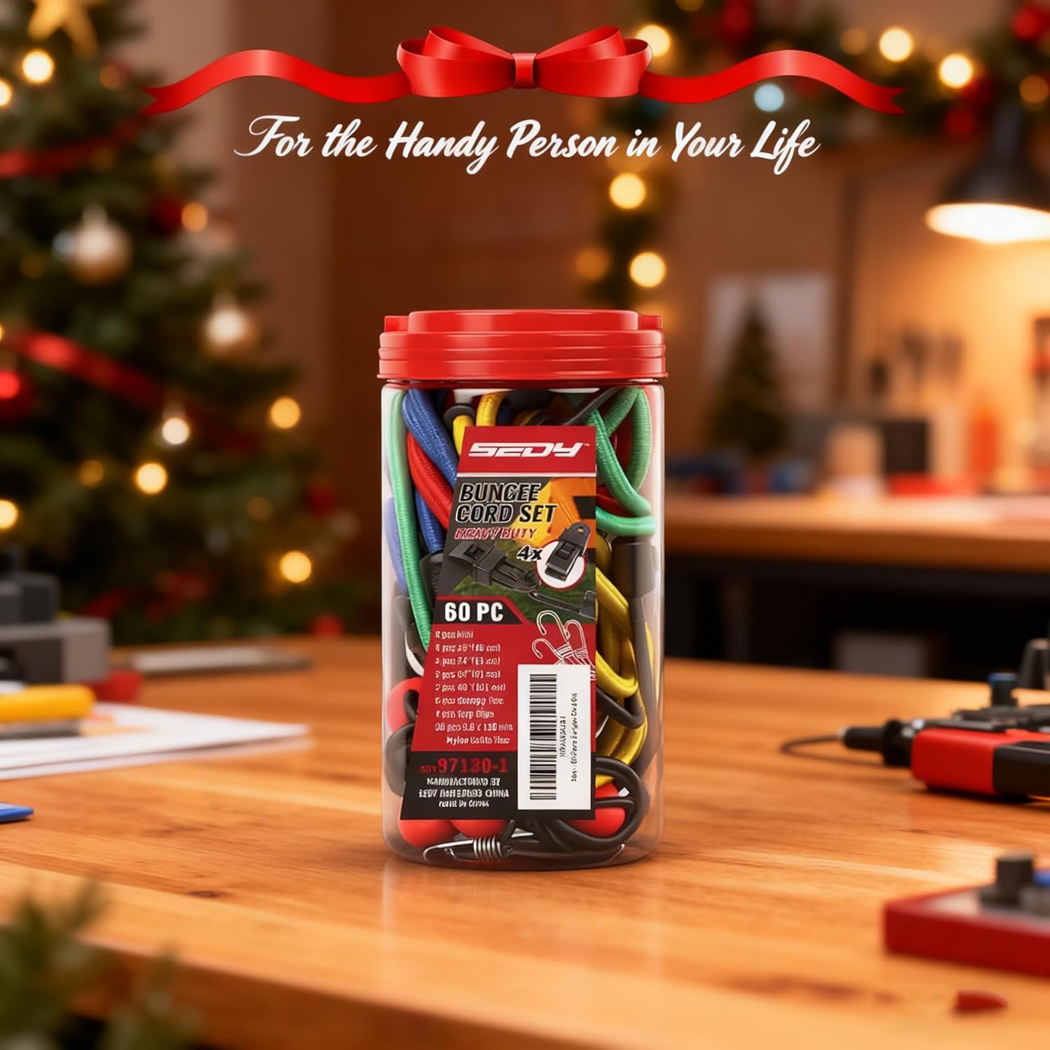 COLOR CODED ORGANIZATION – Easily identify the right length for the job with color-coded bungee cords stored in a transparent jar. Keep your garage or toolbox organized and ready for any task.