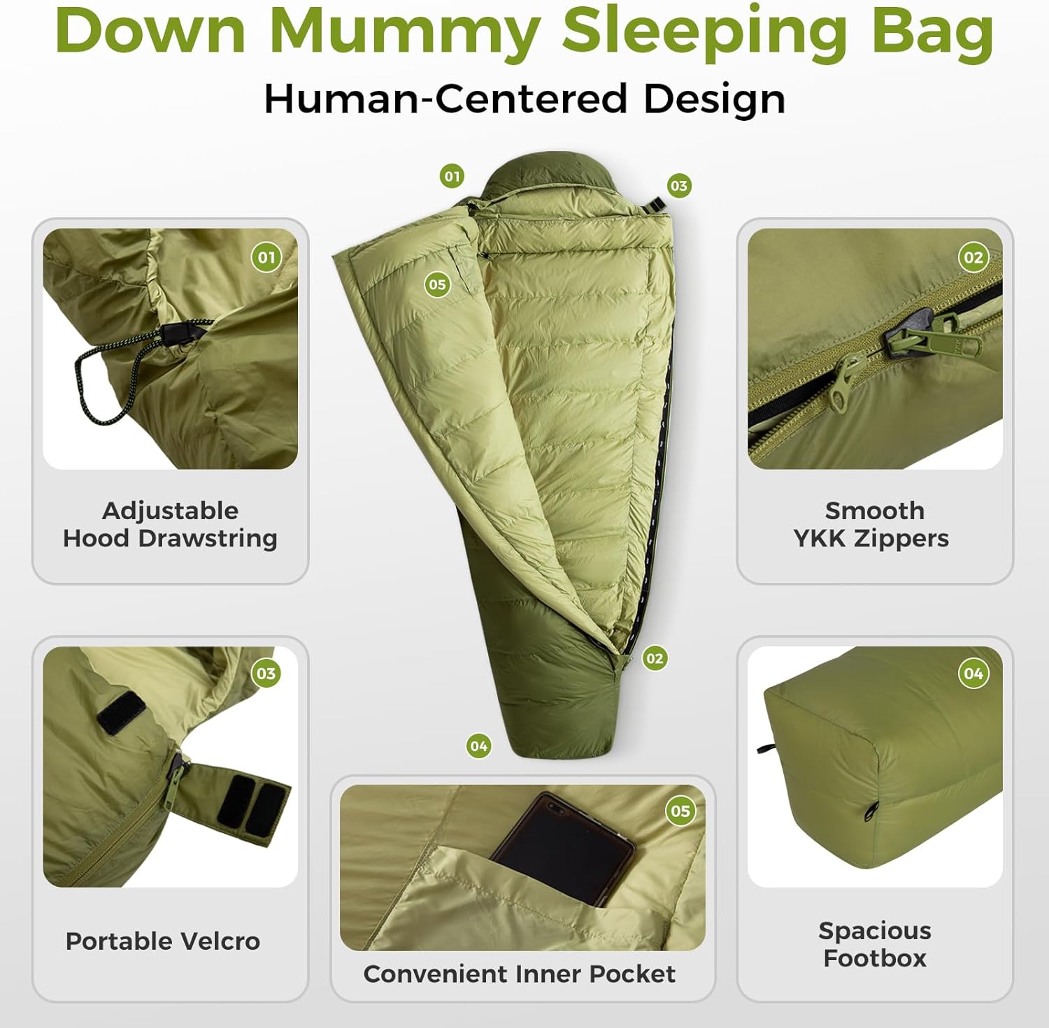 ECO-FRIENDLY & DURABLE MATERIALS WITH HUMANIZED DETAILS: Crafted with a GRS-certified 15D recycled nylon shell and 20D nylon liner for lightweight durability and moisture resistance. Features a smooth YKK two-way zipper, internal pocket, 3D boxed footbox for natural foot positioning, windproof draft strip with anti-snag tape, and an adjustable hood drawstring for a secure, comfortable fit.