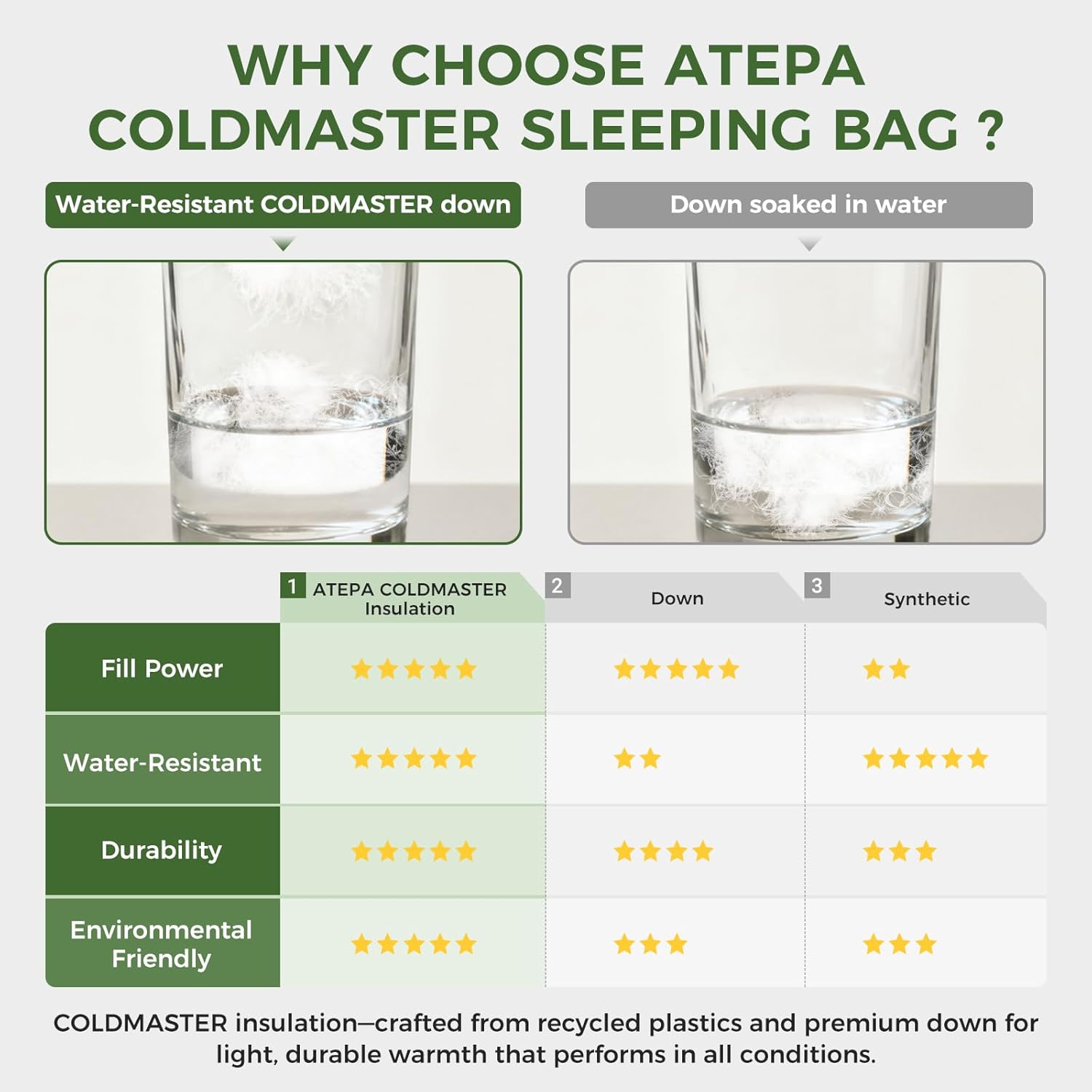 DOWN SLEEPING BAGS: Filled with 300g COLDMASTER Down, these sleeping bags for adults has unique vertical/horizontal baffle stitching to prevent cold spots, and windproof drawstrings and zipper draft tubes block chilling air flow. You can free your feet to stay cool in warm weather by opening the bottom zipper. Comfort rating 50℉, Limit rating 45℉, Extreme rating 25℉, it provides warmth as a 3 season sleeping bag